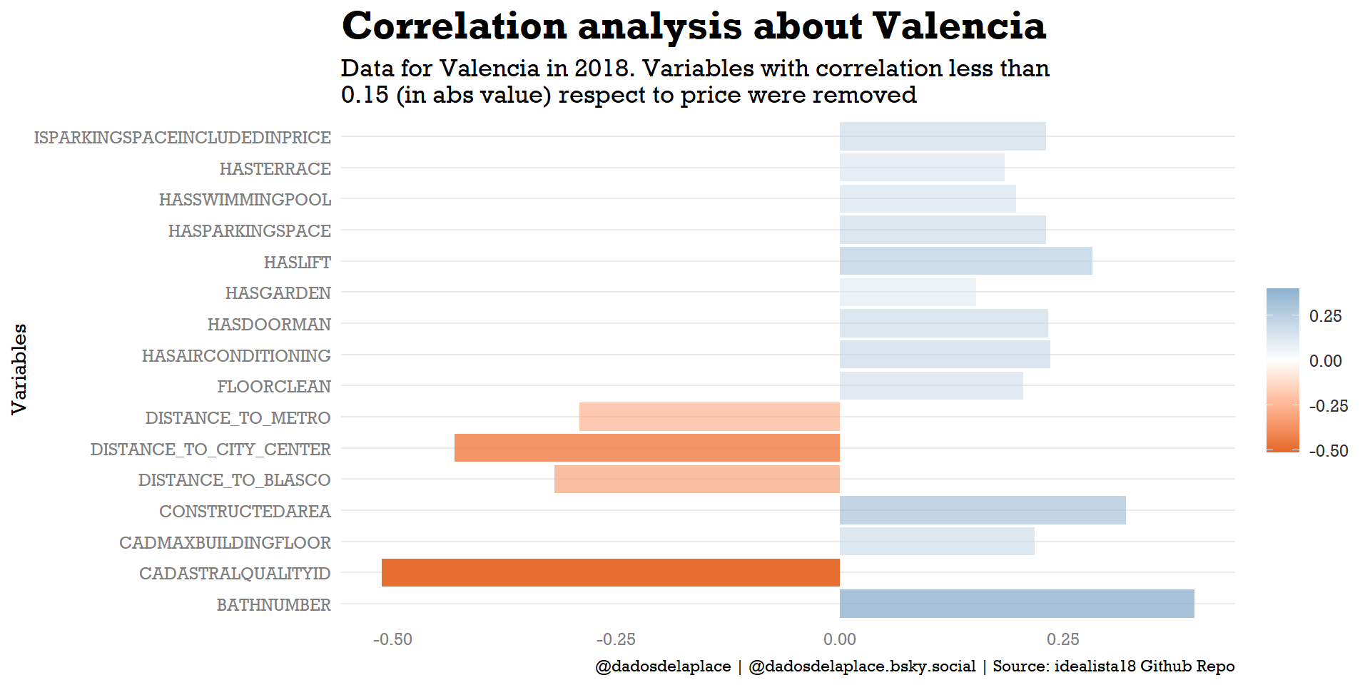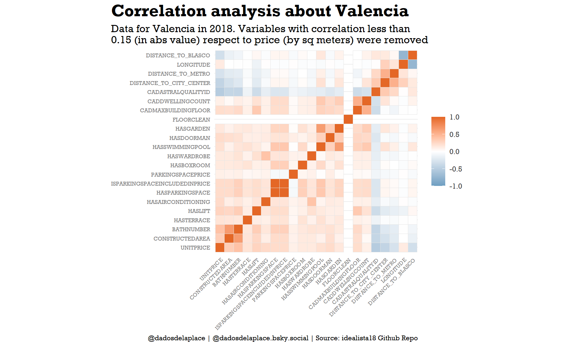 subtitle = "Data for Valencia in 2018. Variables with correlation less than\n0.15 (in abs value) respect to price (by sq meters) were removed",