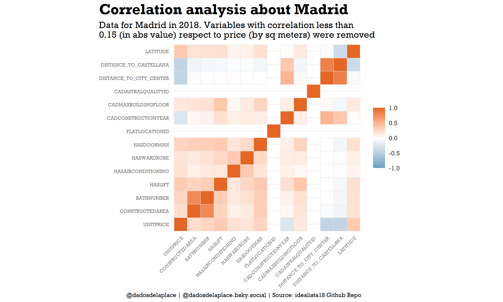 subtitle = "Data for Madrid in 2018. Variables with correlation less than\n0.15 (in abs value) respect to price (by sq meters) were removed",