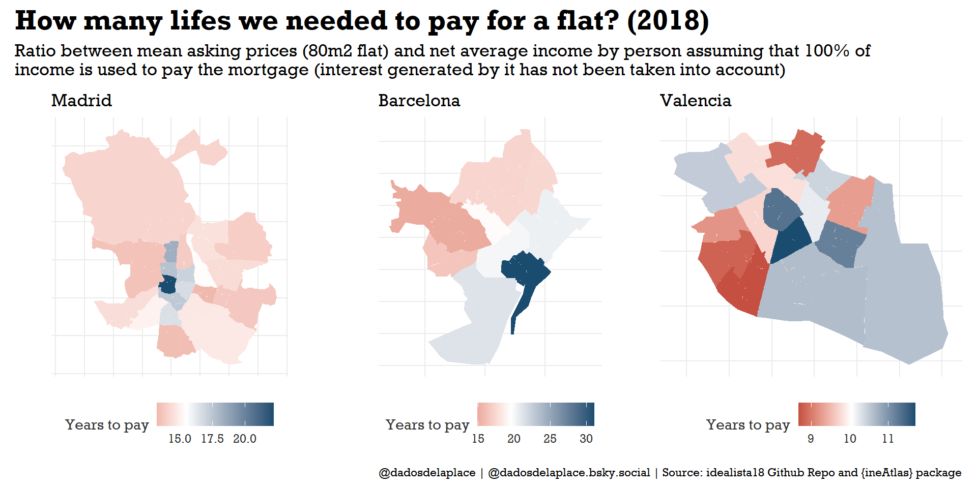 By combining it with data from INE ({ineAtlas} package), we can calculate the number of years required in 2018 to pay.