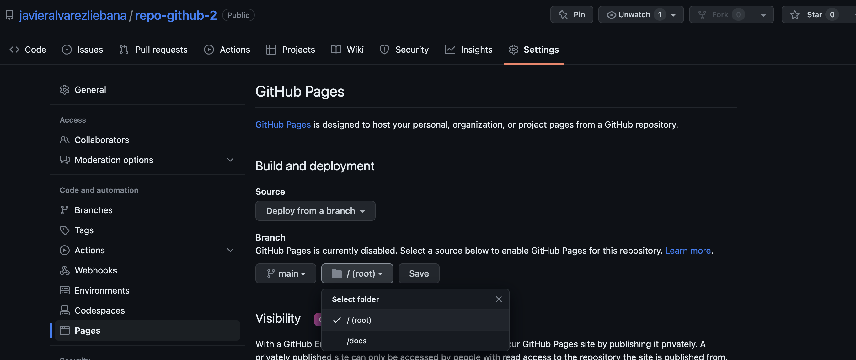 SettingsPagesbranch selecciona la única rama que tenemos ahora (main).html (en web complejas estará como en cualquier web en docs, en algo simple estará en la ruta raiz del repositorio)SaveSi te fijas en la parte superior del repositorio ahora tenemos un icono naranja, que nos indica que la web está en proceso de ser desplegada (deploy)