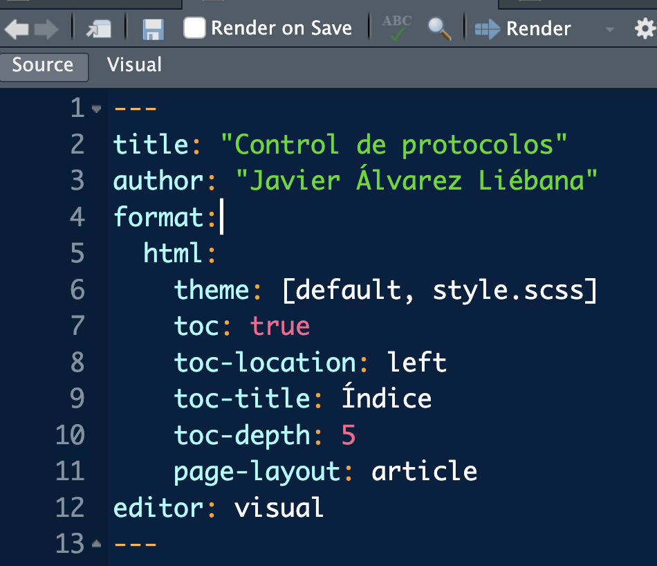 Si a tu .qmd ya le llamas de inicio index.qmd, automáticamente, al detectar Github un index.html, interpreta que ese archivo index.html es el que define la web (y puedes personalizar añadiendo un archivo css de estilos)