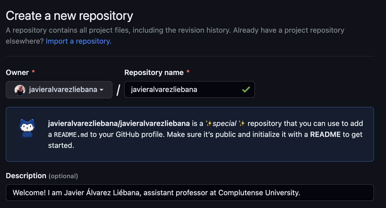 Repository name: el nombre del repositorio. En este caso vamos a crear un repositorio muy concreto: el nombre debe coincidir exactamente con tu nombre de usuario