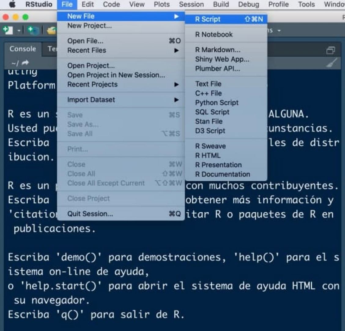 Un script será el documento en el que programamos, nuestro archivo .doc (aquí con extensión .R) donde escribiremos las órdenes. Para abrir nuestro primero script, haz click en el menú en File < New File < R Script.