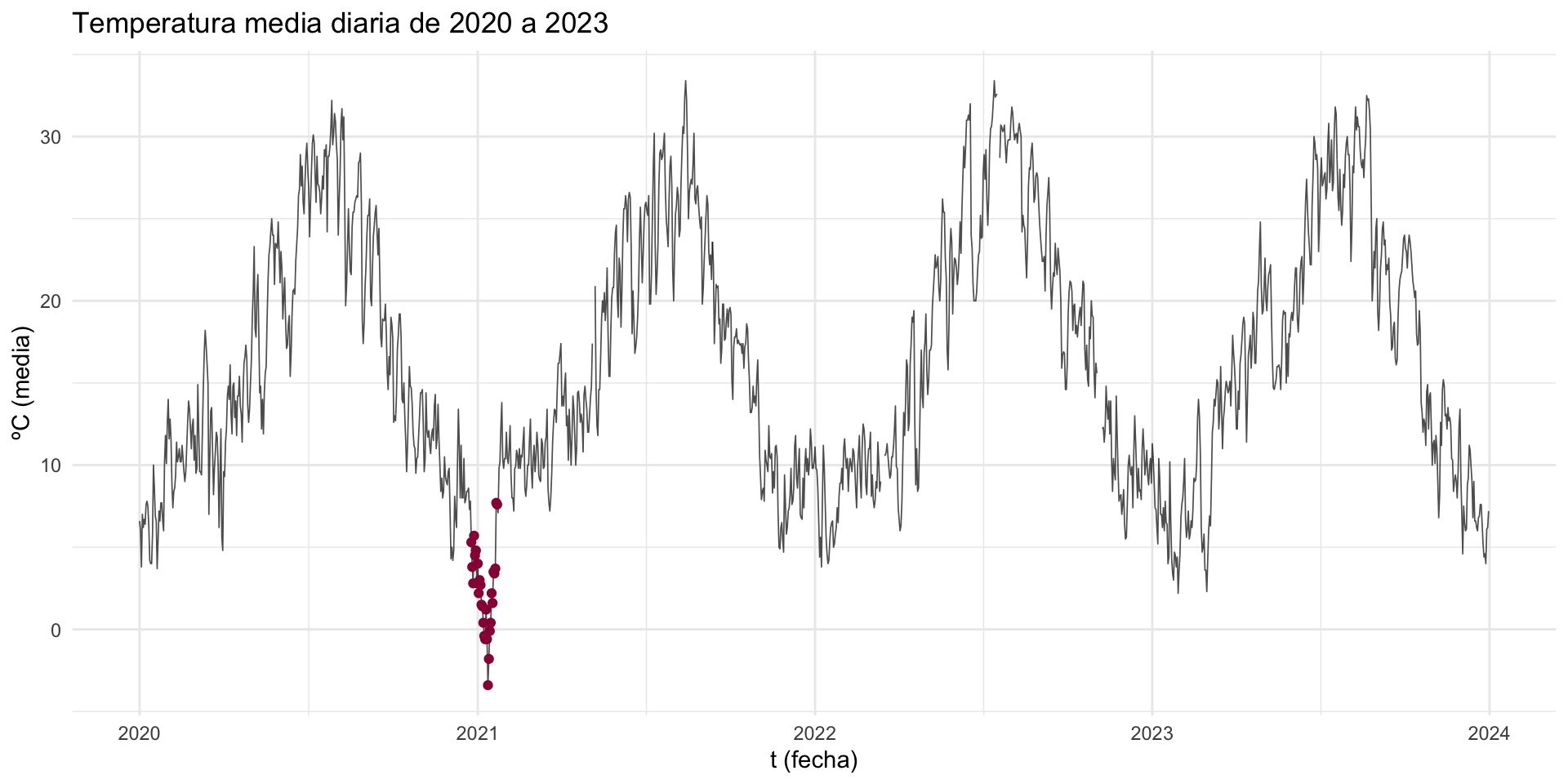 ggplot(retiro |>filter(between(fecha, as_date("2020-01-01"), as_date("2023-12-31"))) |>mutate(filomena =between(fecha, as_date("2020-12-25"), as_date("2021-01-22"))),aes(x = fecha, y = tmed)) +geom_line(linewidth =0.3, alpha =0.7) +geom_point(aes(alpha = filomena), color ="#991545") +scale_alpha_manual(values =c(0, 1)) +guides(alpha ="none") +theme_minimal() +labs(title ="Temperatura media diaria de 2020 a 2023",x ="t (fecha)", y ="ºC (media)")