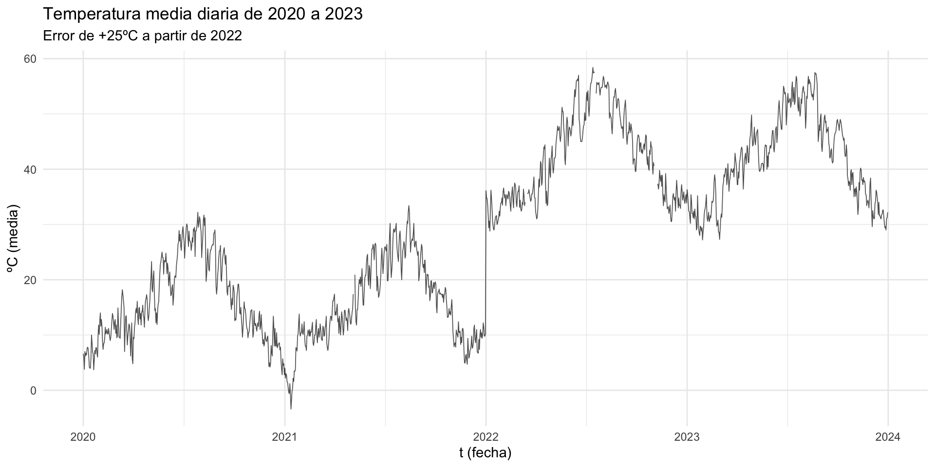ggplot(retiro |>filter(between(fecha, as_date("2020-01-01"), as_date("2023-12-31"))) |>mutate(tmed =if_else(fecha <="2021-12-31", tmed, tmed +25))) +geom_line(aes(x = fecha, y = tmed), linewidth =0.3, alpha =0.7) +guides(alpha ="none") +theme_minimal() +labs(title ="Temperatura media diaria de 2020 a 2023",subtitle ="Error de +25ºC a partir de 2022",x ="t (fecha)", y ="ºC (media)")