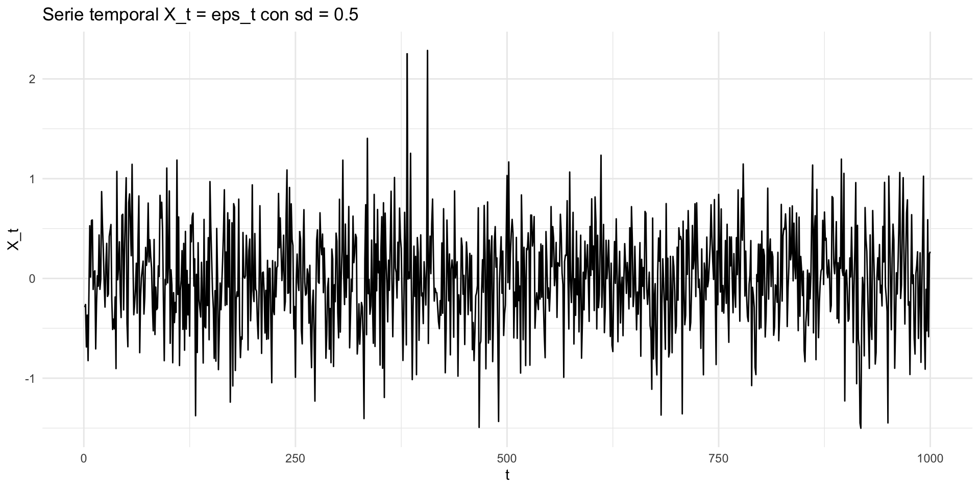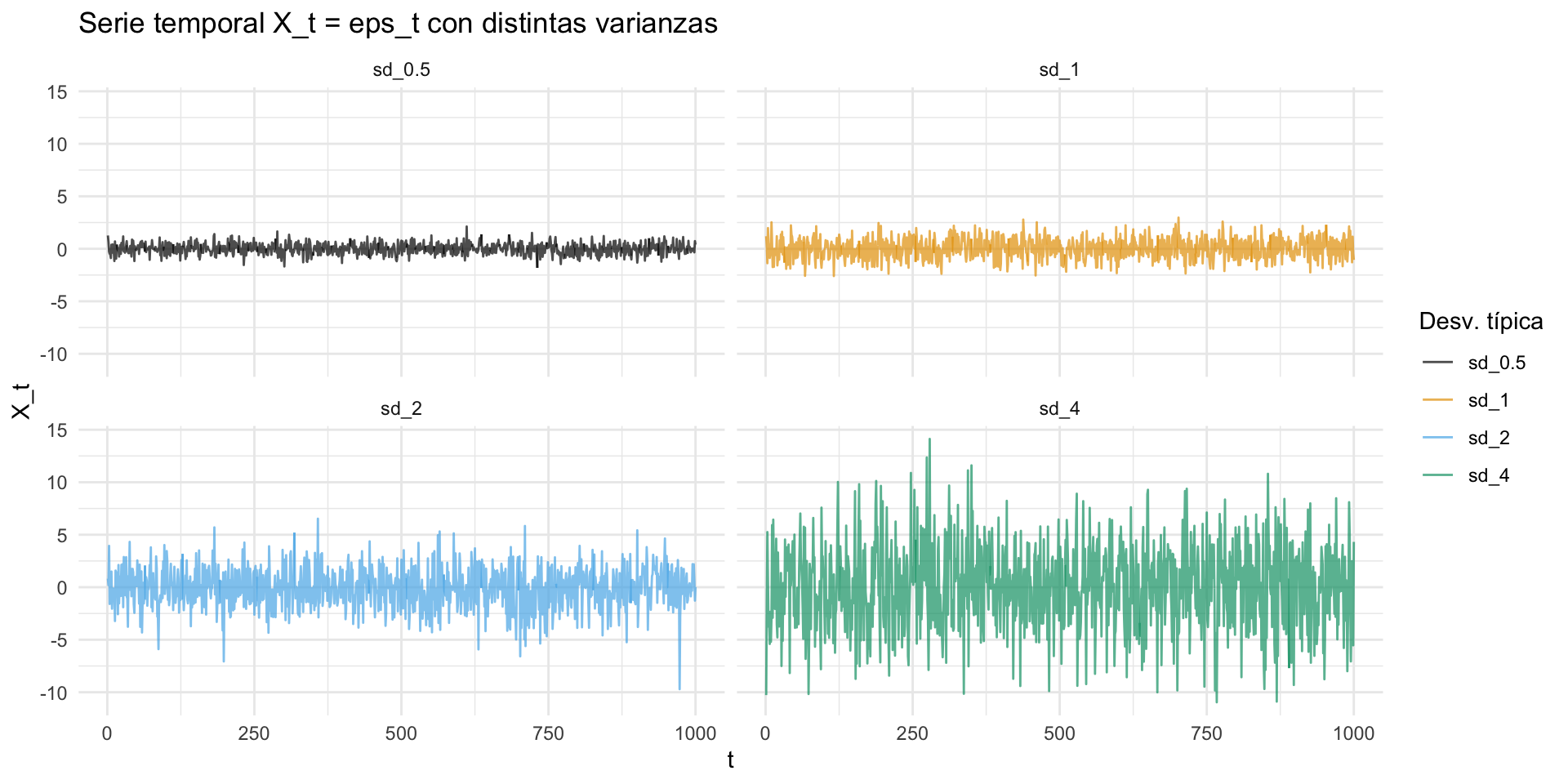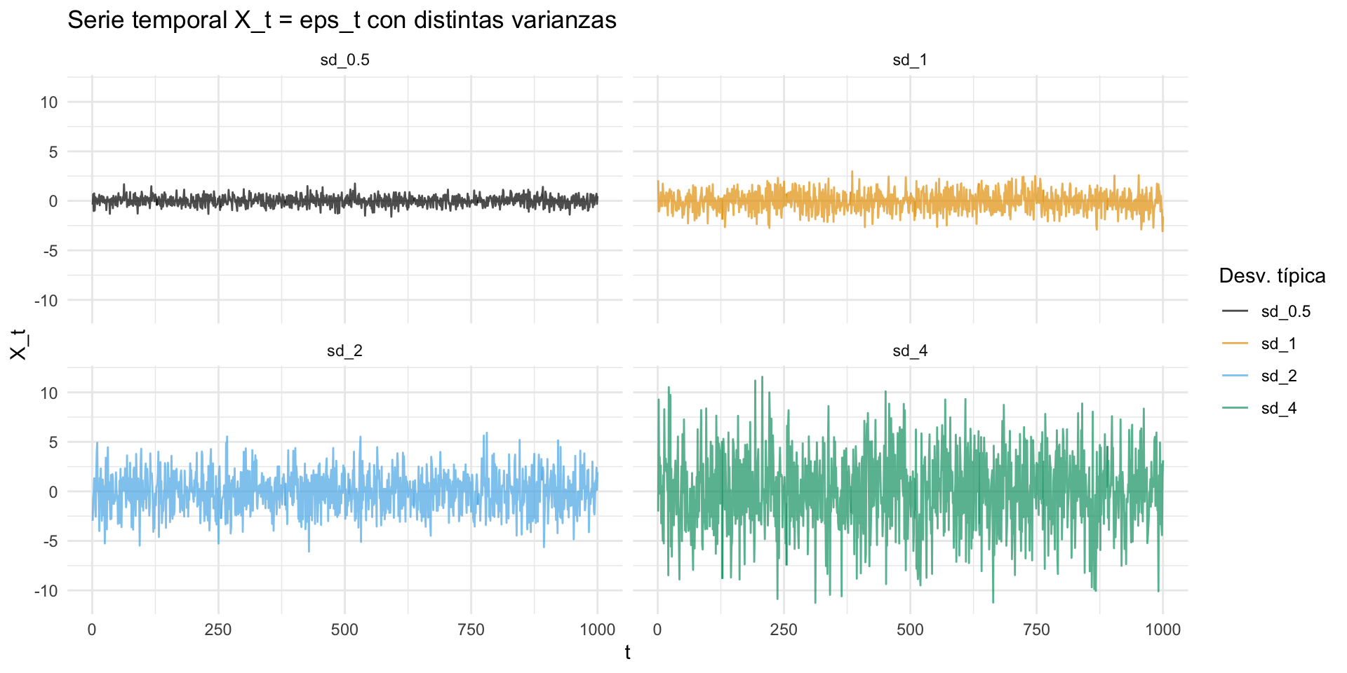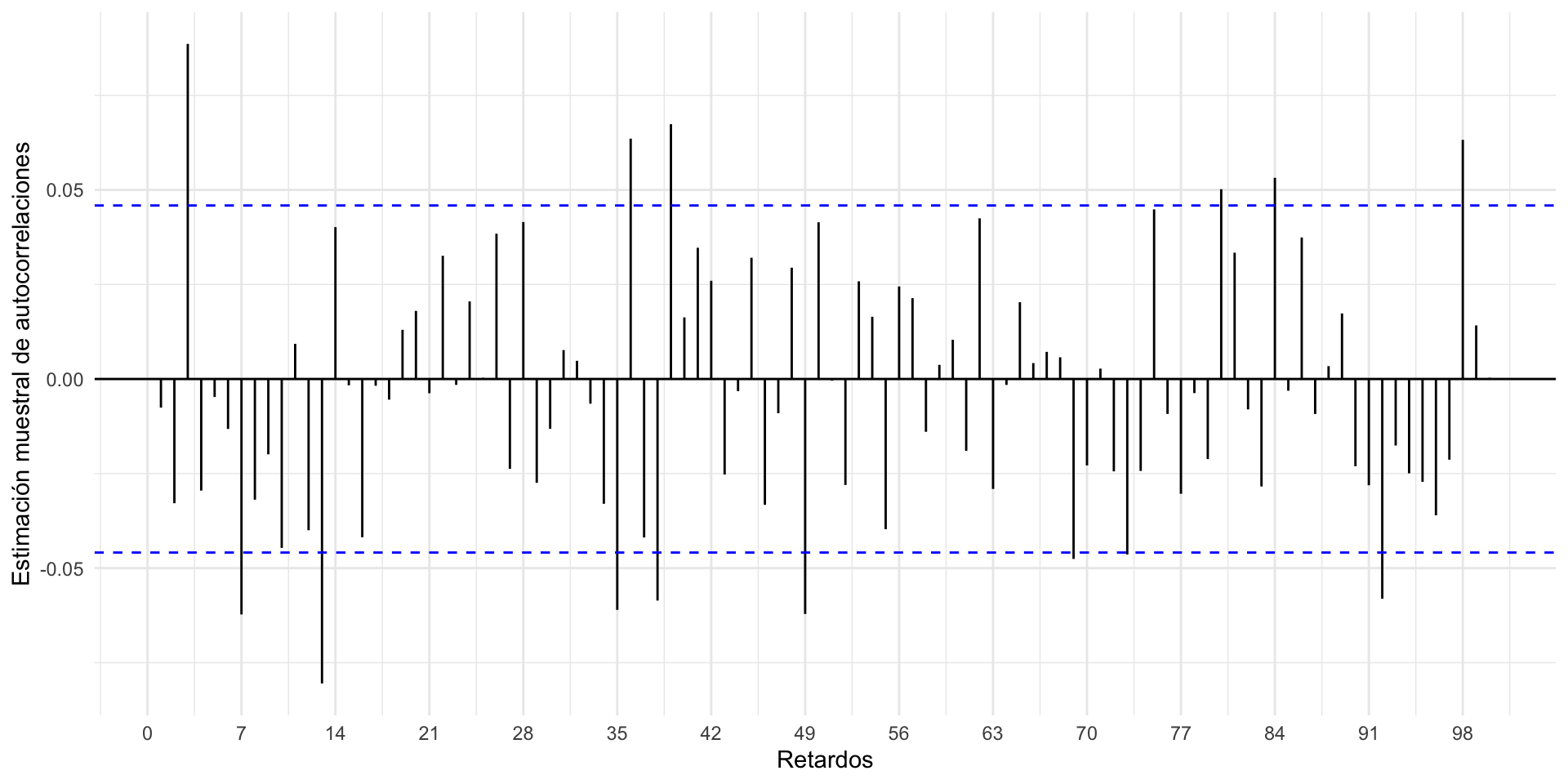 Si no fuese ruido blanco, ¿es estacionario? Un proceso estacionario tiene a) media constante; b) varianza constante; c) correlaciones solo dependientes del lag \(h\).