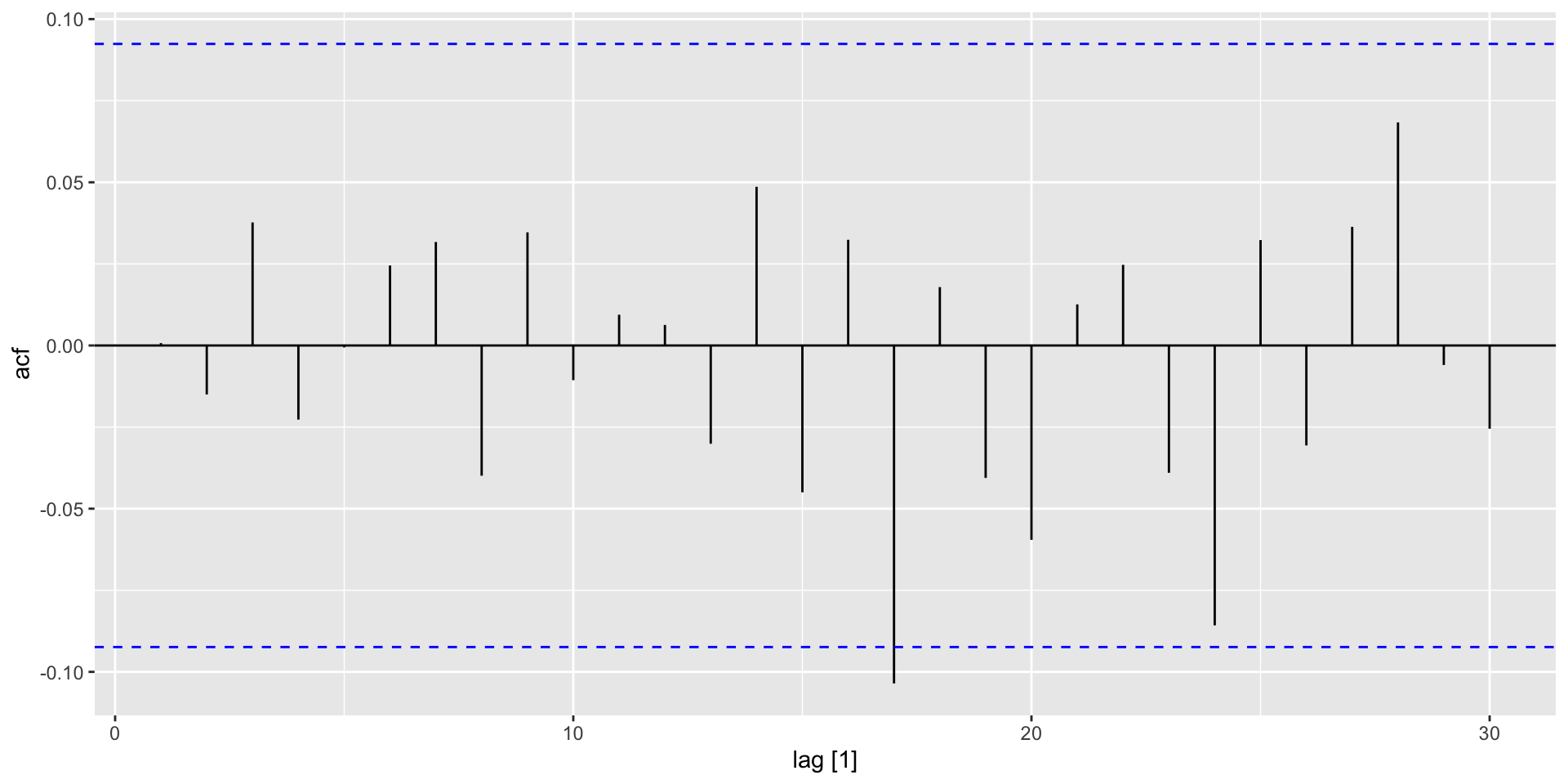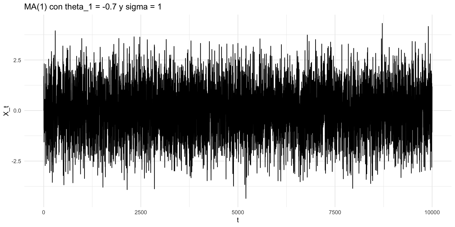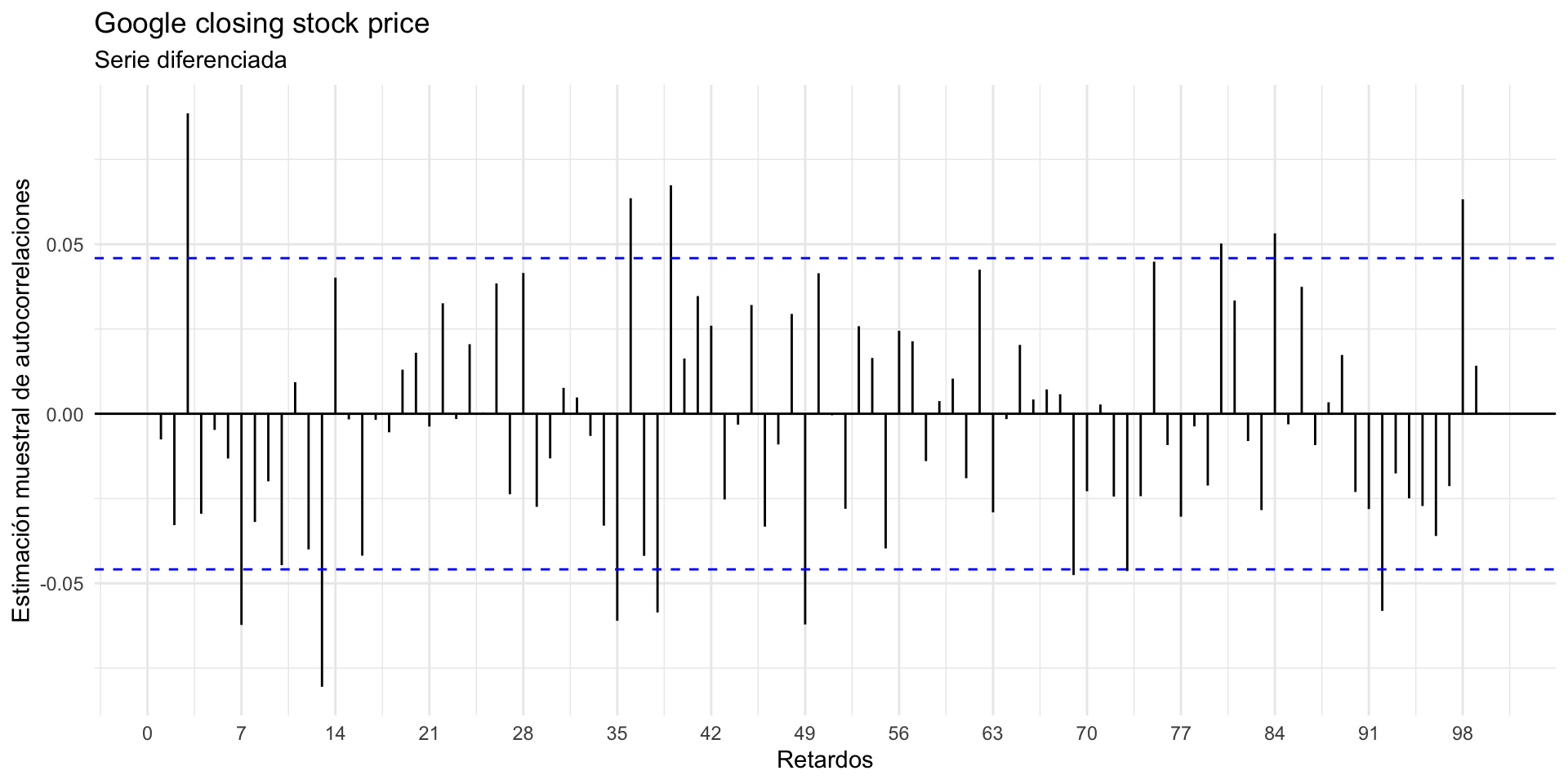 Si no fuese ruido blanco, ¿es estacionario? Un proceso estacionario tiene a) media constante; b) varianza constante; c) correlaciones solo dependientes del lag \(h\).