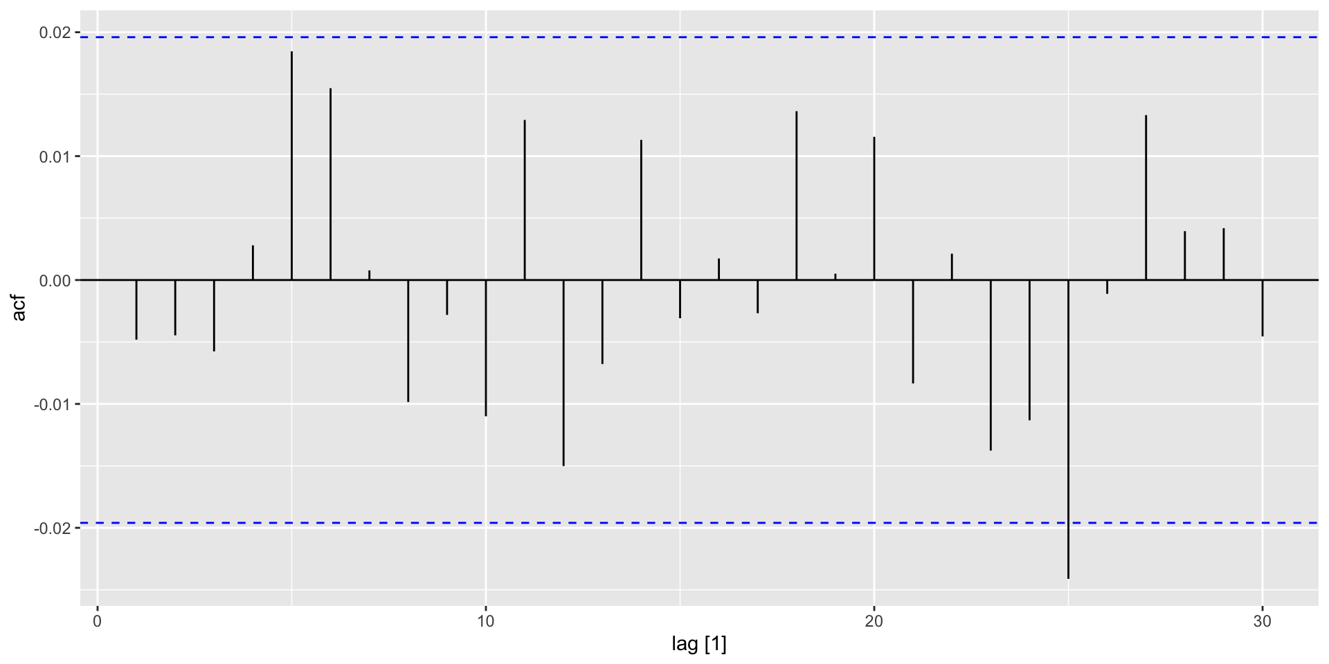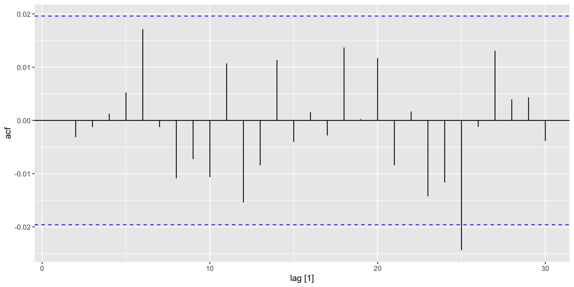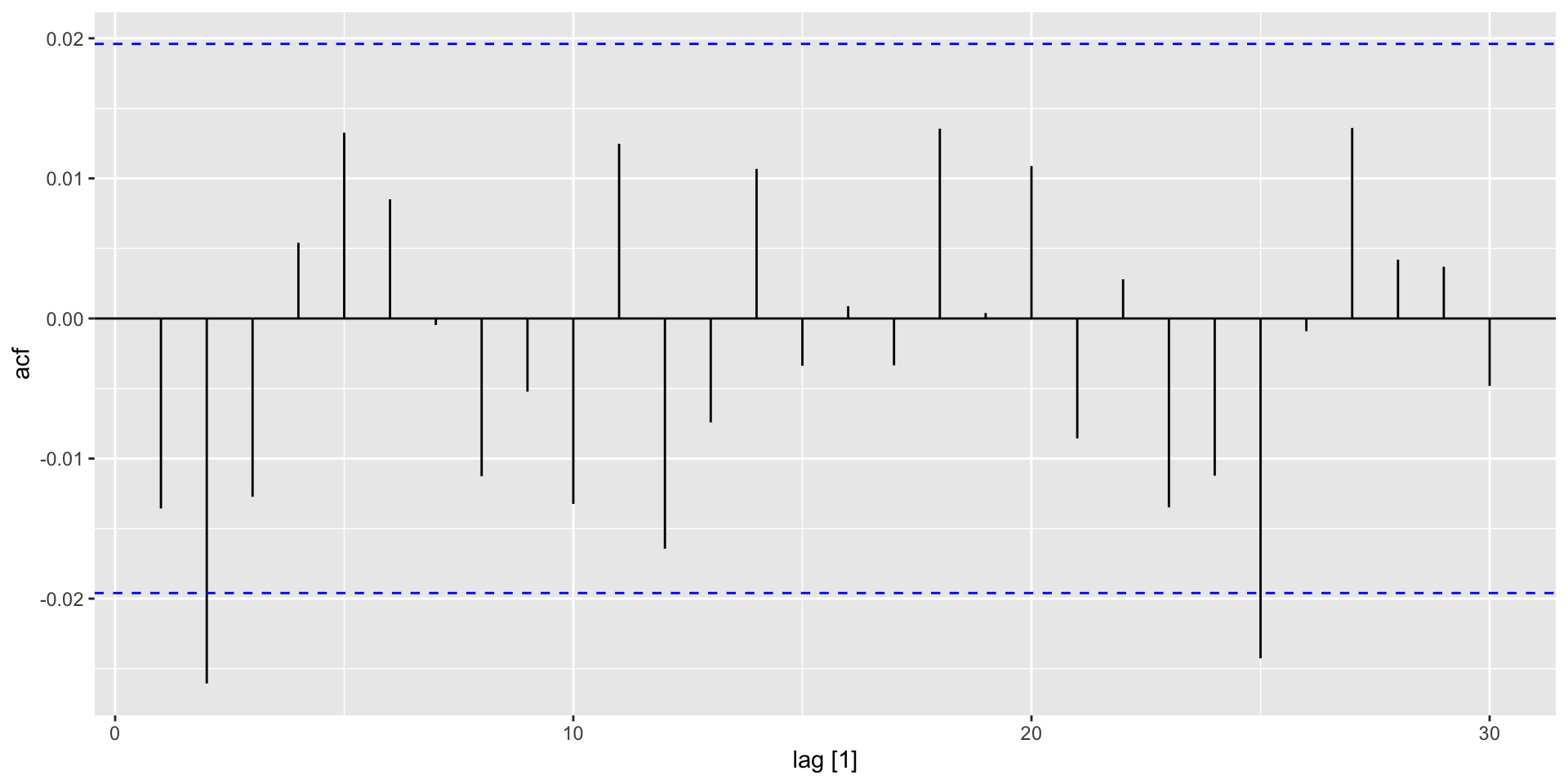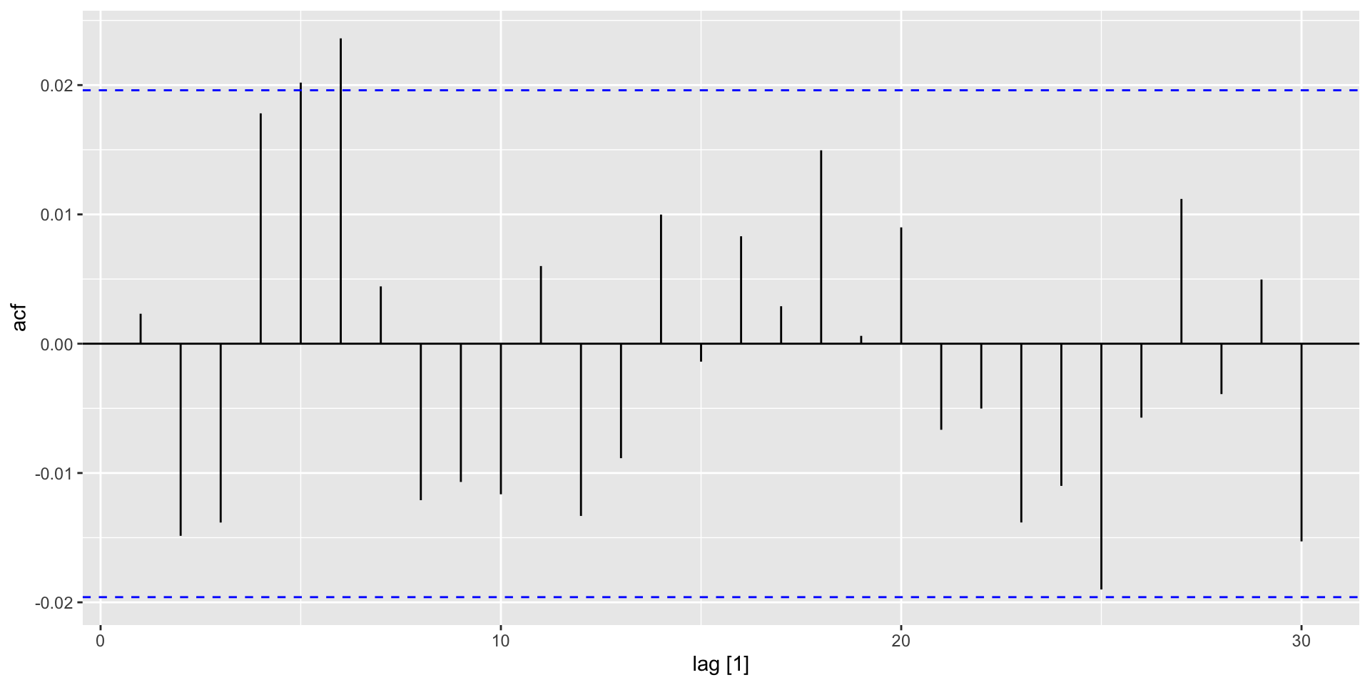 Si no fuese ruido blanco, ¿es estacionario? Un proceso estacionario tiene a) media constante; b) varianza constante; c) correlaciones solo dependientes del lag \(h\).