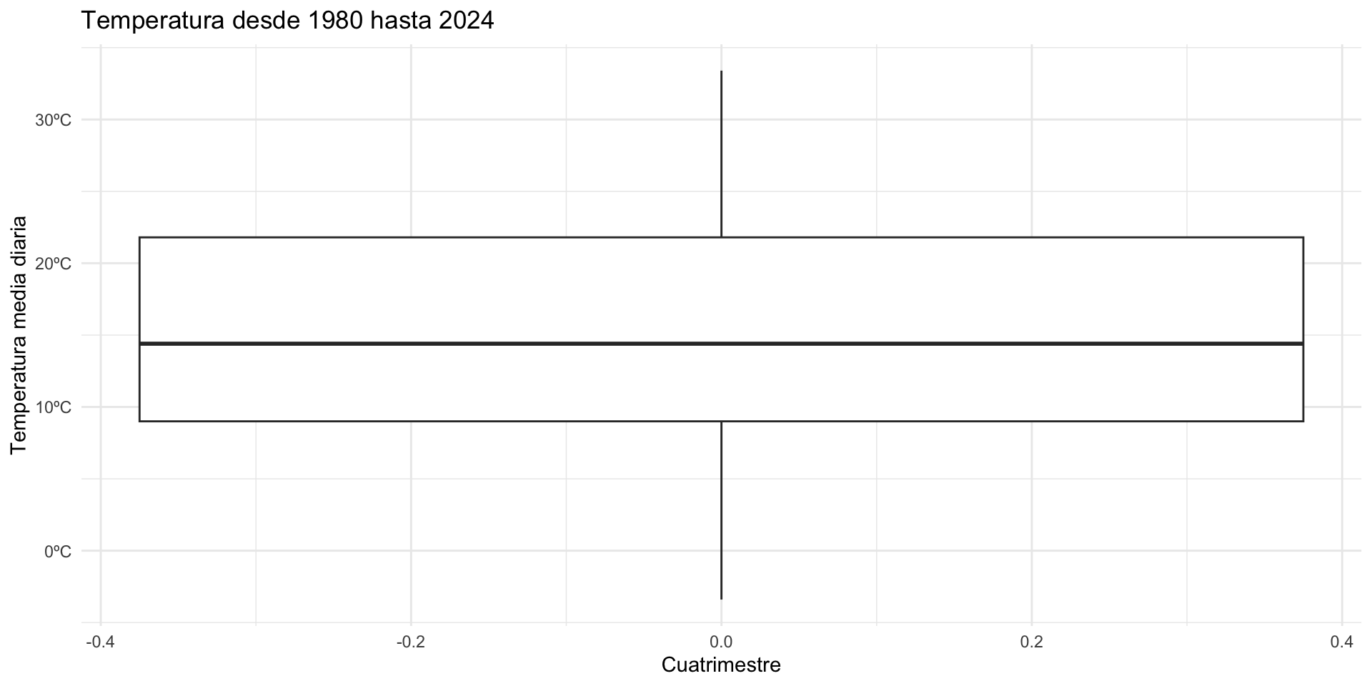 library(tidyverse)ggplot(retiro) +geom_boxplot(aes(y = tmed)) +scale_y_continuous(labels = scales::label_number(suffix ="ºC")) +theme_minimal() +labs(title ="Temperatura desde 1980 hasta 2024",x ="Cuatrimestre", y ="Temperatura media diaria")