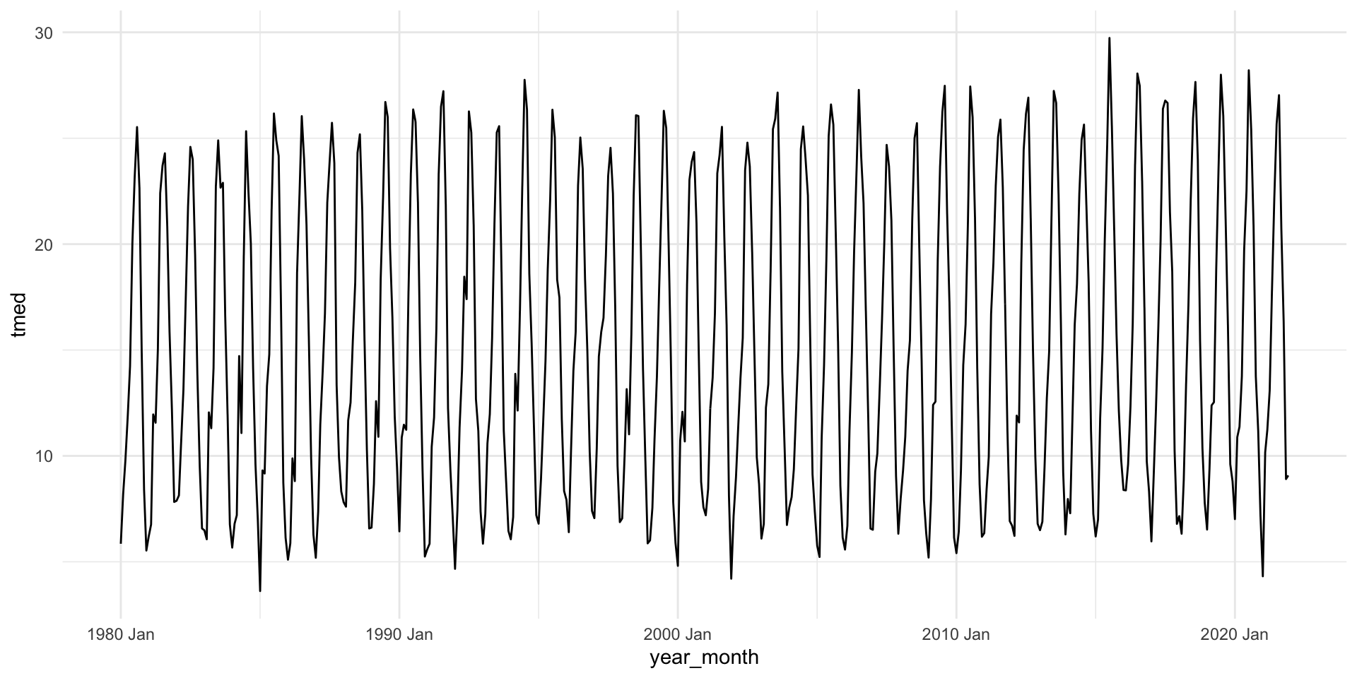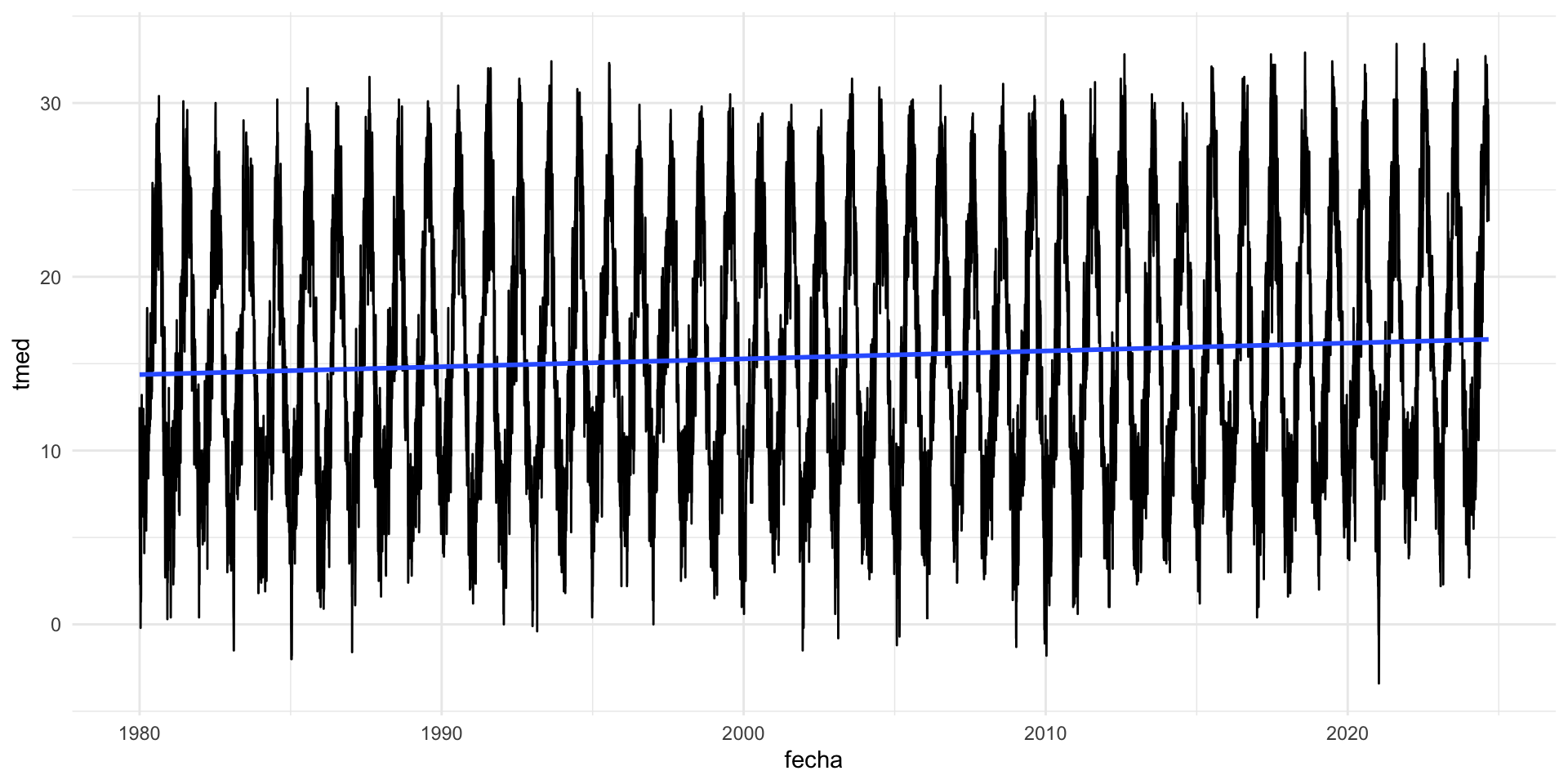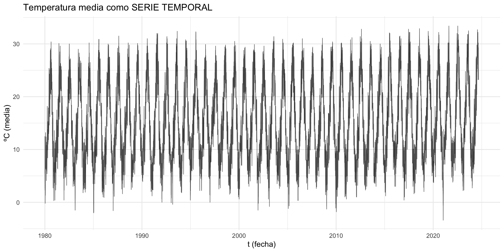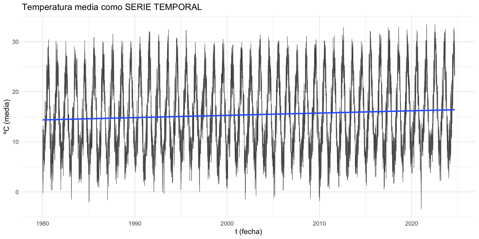 ggplot(retiro, aes(x = fecha, y = tmed)) +geom_line(linewidth =0.3, alpha =0.7) +geom_smooth(method ="lm", se =FALSE) +theme_minimal() +labs(title ="Temperatura media como SERIE TEMPORAL",x ="t (fecha)", y ="ºC (media)")