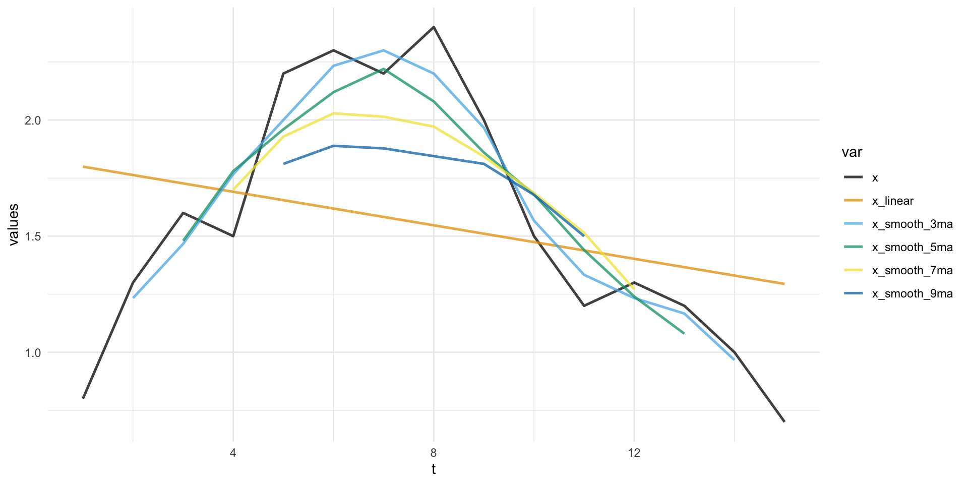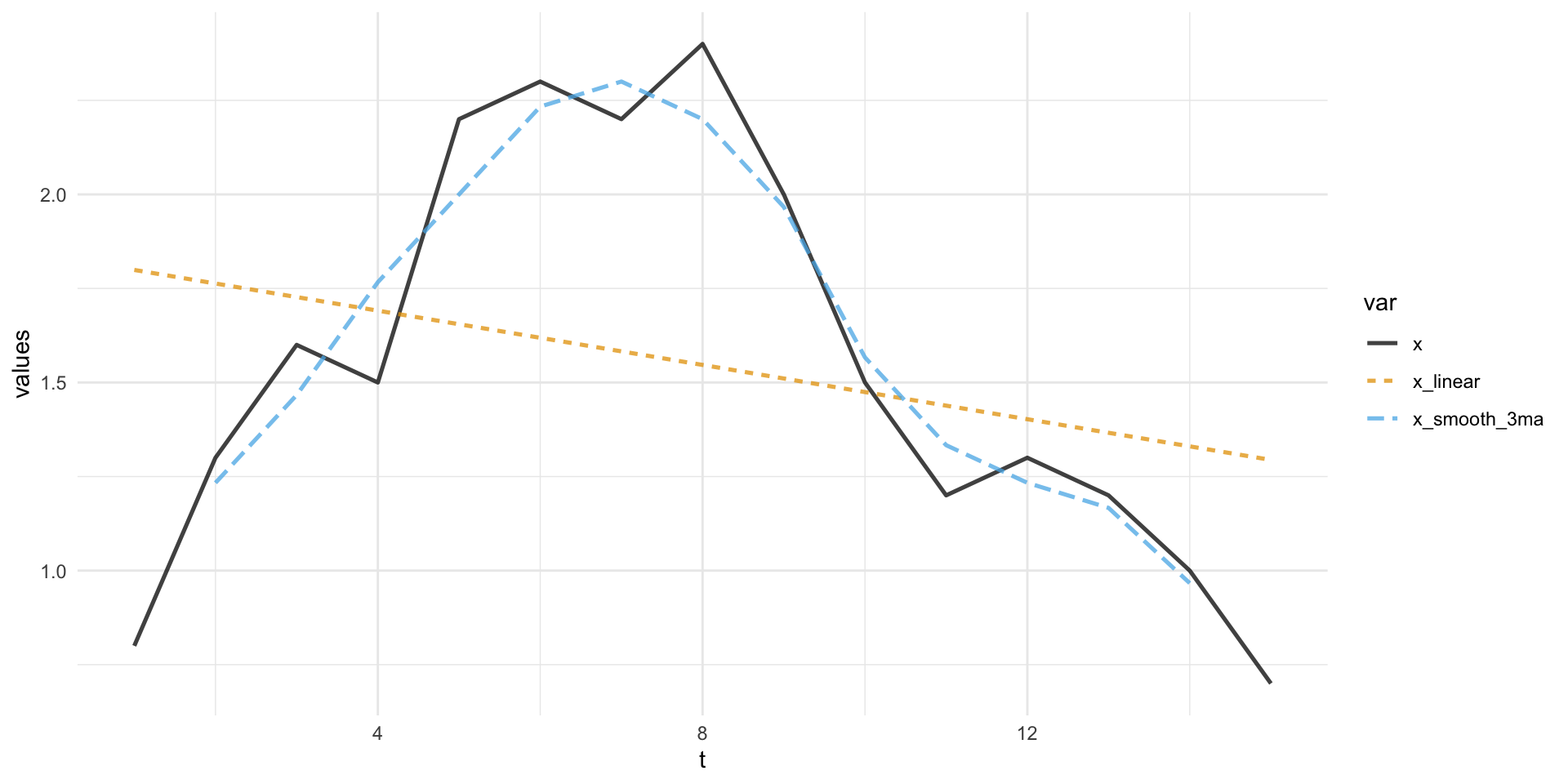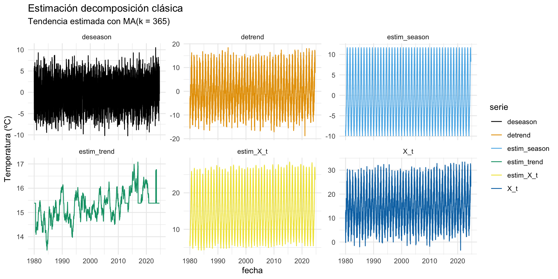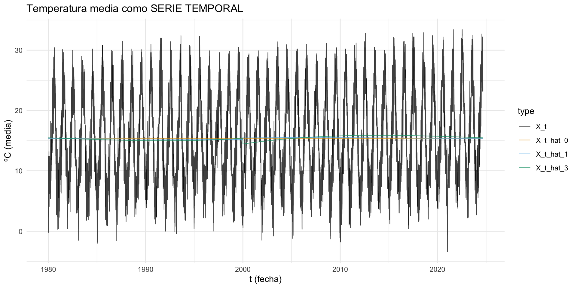 ggplot(retiro, aes(x = fecha, y = tmed)) +geom_line(linewidth =0.3, alpha =0.7) +geom_smooth(method ="lm", se =FALSE) +theme_minimal() +labs(title ="Temperatura media como SERIE TEMPORAL",x ="t (fecha)", y ="ºC (media)")