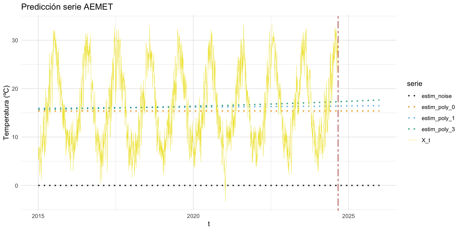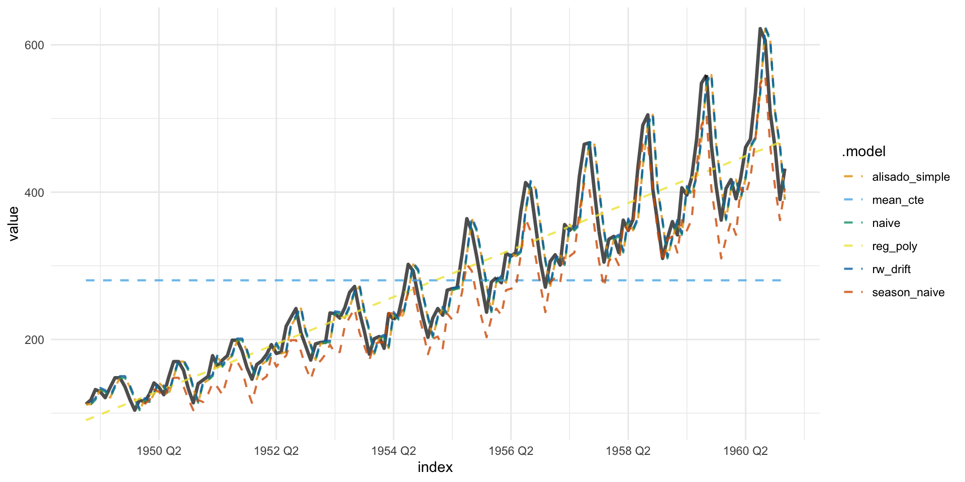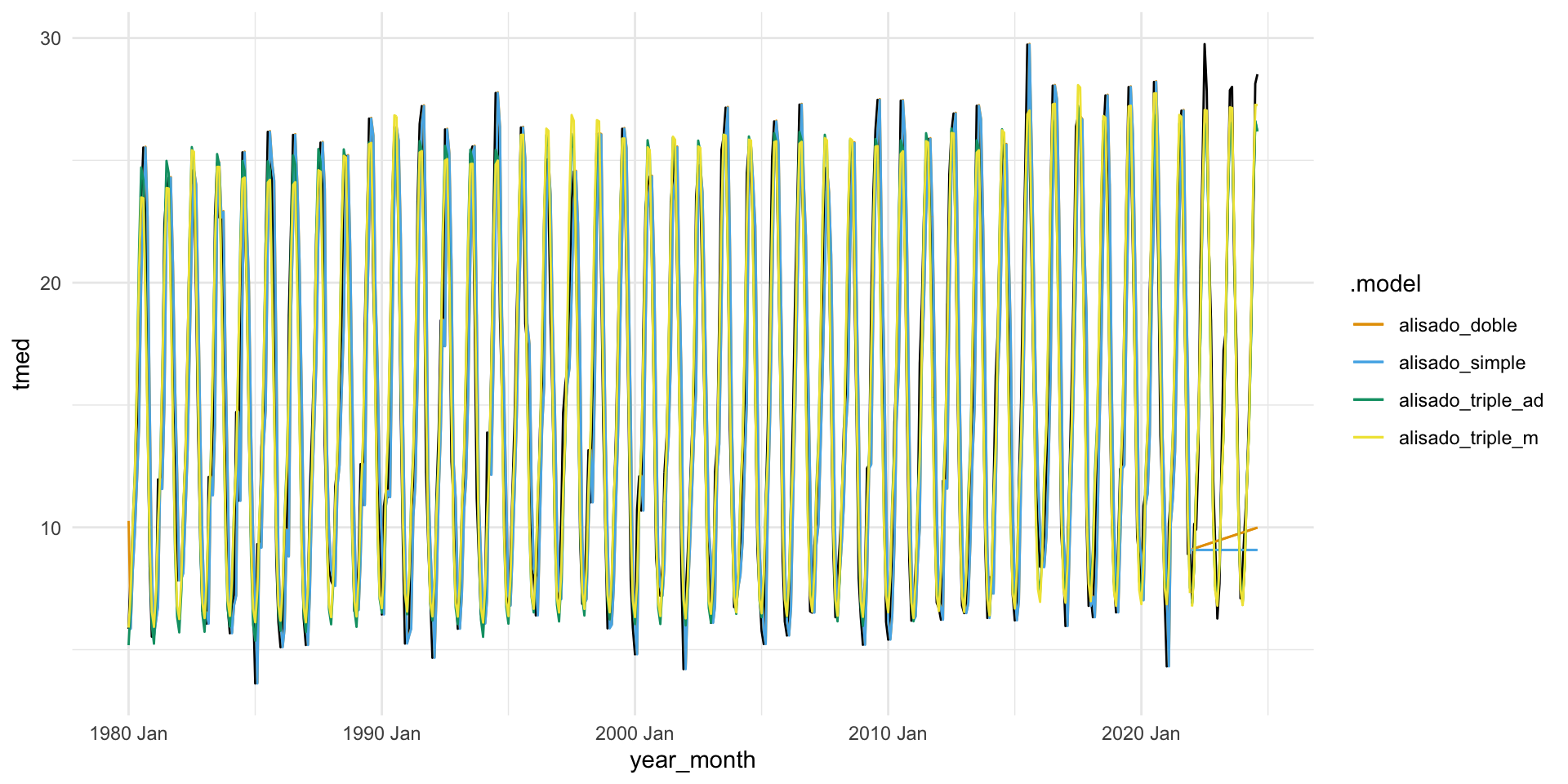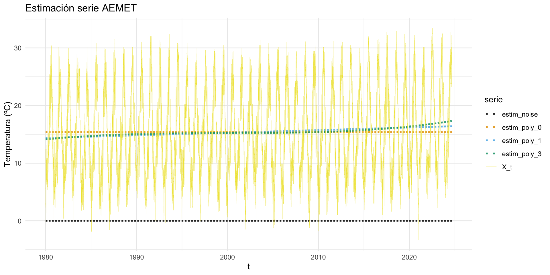 fit <- data_cv |>model("ARMA_11"=ARIMA(X_t ~pdq(p =1, d =0, q =1), ic ="bic"),"ARMA_22"=ARIMA(X_t ~pdq(p =2, d =0, q =2), ic ="bic"),"ARMA_stepwise_greedy"=ARIMA(X_t ~pdq(p_init =1, d =0, q_init =1), ic ="bic"),"ARMA_stepwise"=ARIMA(X_t ~pdq(p_init =1, d =0, q_init =1), ic ="bic", greedy =FALSE),"ARMA"=ARIMA(X_t ~pdq(p_init =1, d =0, q_init =1), ic ="bic", greedy =FALSE, stepwise =FALSE))estimaciones <- fit |>augment()