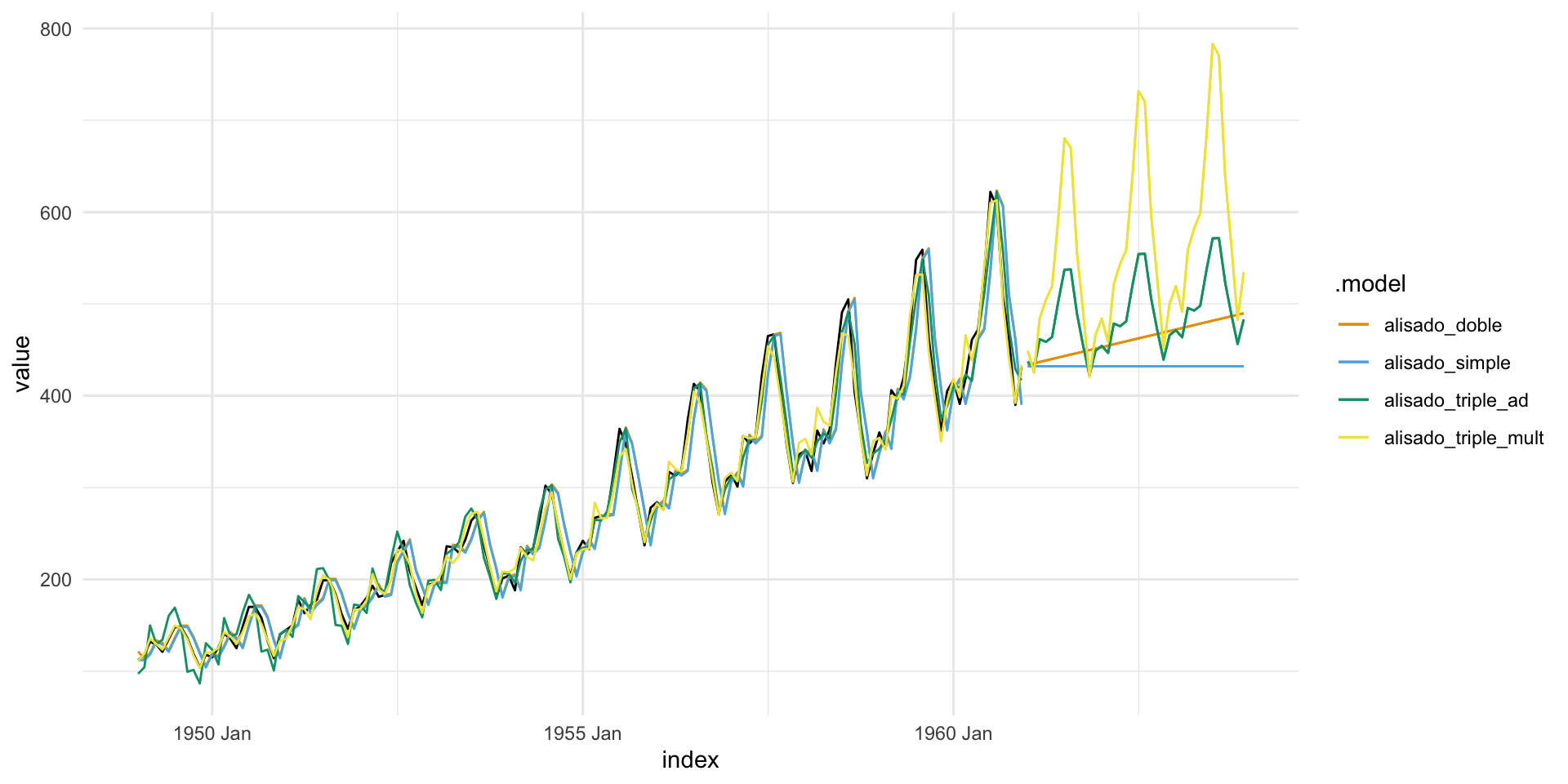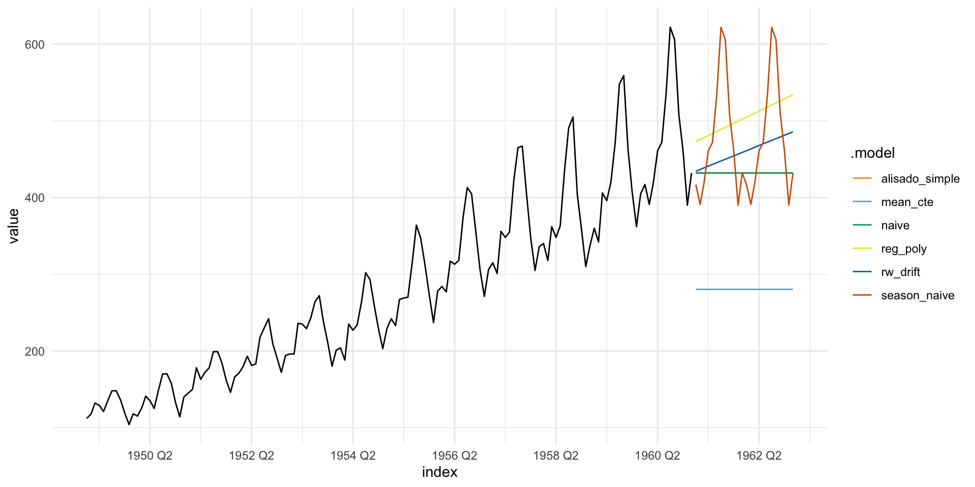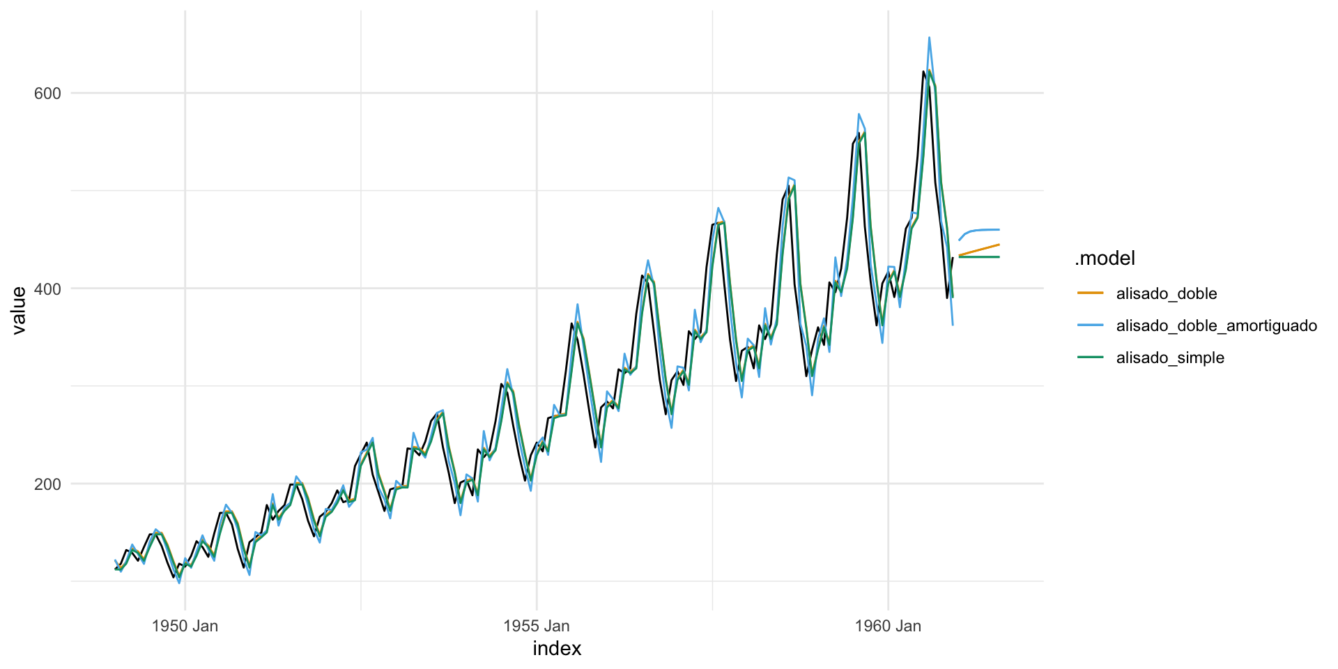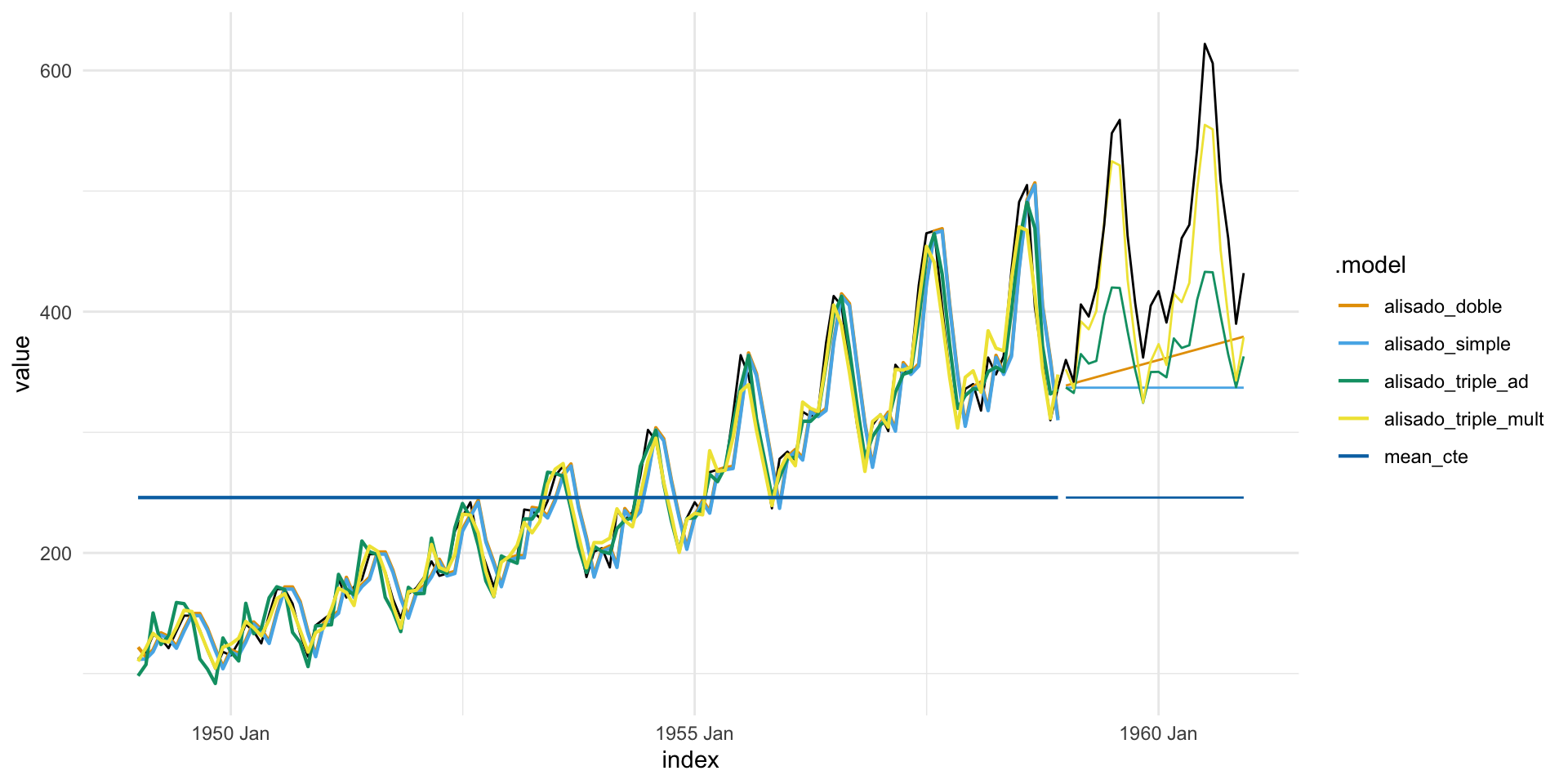 fit <- data_cv |>model("ARMA_11"=ARIMA(X_t ~pdq(p =1, d =0, q =1), ic ="bic"),"ARMA_22"=ARIMA(X_t ~pdq(p =2, d =0, q =2), ic ="bic"),"ARMA_stepwise_greedy"=ARIMA(X_t ~pdq(p_init =1, d =0, q_init =1), ic ="bic"),"ARMA_stepwise"=ARIMA(X_t ~pdq(p_init =1, d =0, q_init =1), ic ="bic", greedy =FALSE),"ARMA"=ARIMA(X_t ~pdq(p_init =1, d =0, q_init =1), ic ="bic", greedy =FALSE, stepwise =FALSE))estimaciones <- fit |>augment()