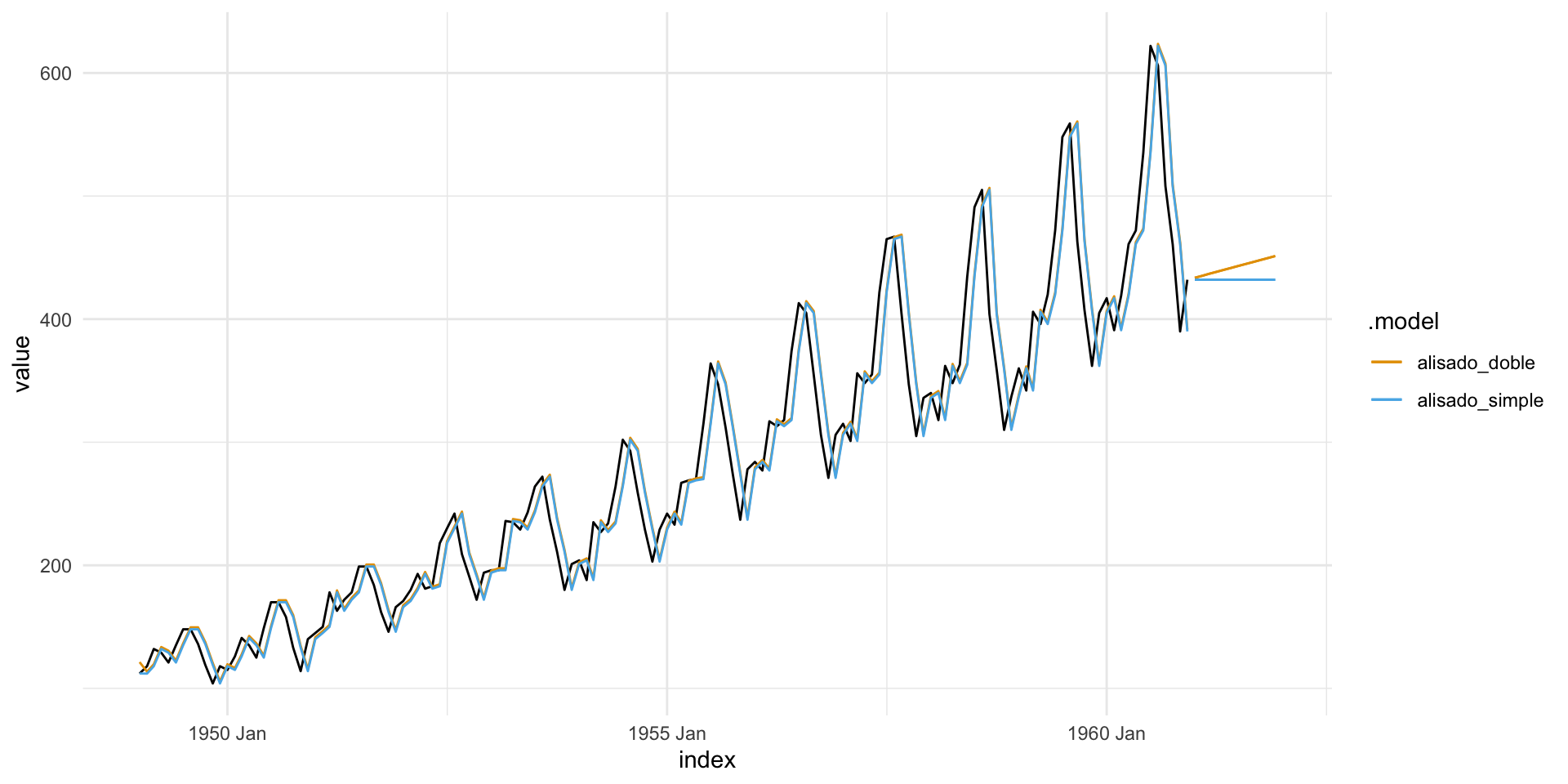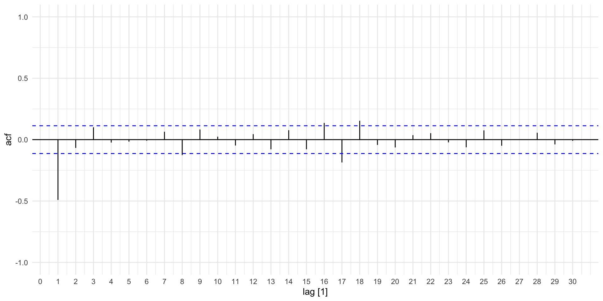 Para identificar el orden \(d\) suele funcionar la regla de que \(d=1\) elimina tendencias lineales y \(d=2\) tendencias cuadráticas. También podemos visualizar la serie tras aplicar difference() o hacer uso del contraste unitroot_ndiffs que nos indica el orden \(d\) que identifica en nuestro proceso (o dejar libre el parámetro en ARIMA() y que el ajuste automática decida)