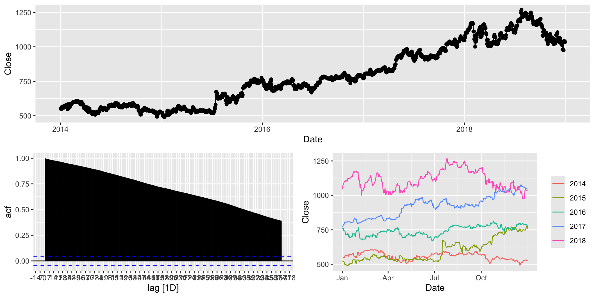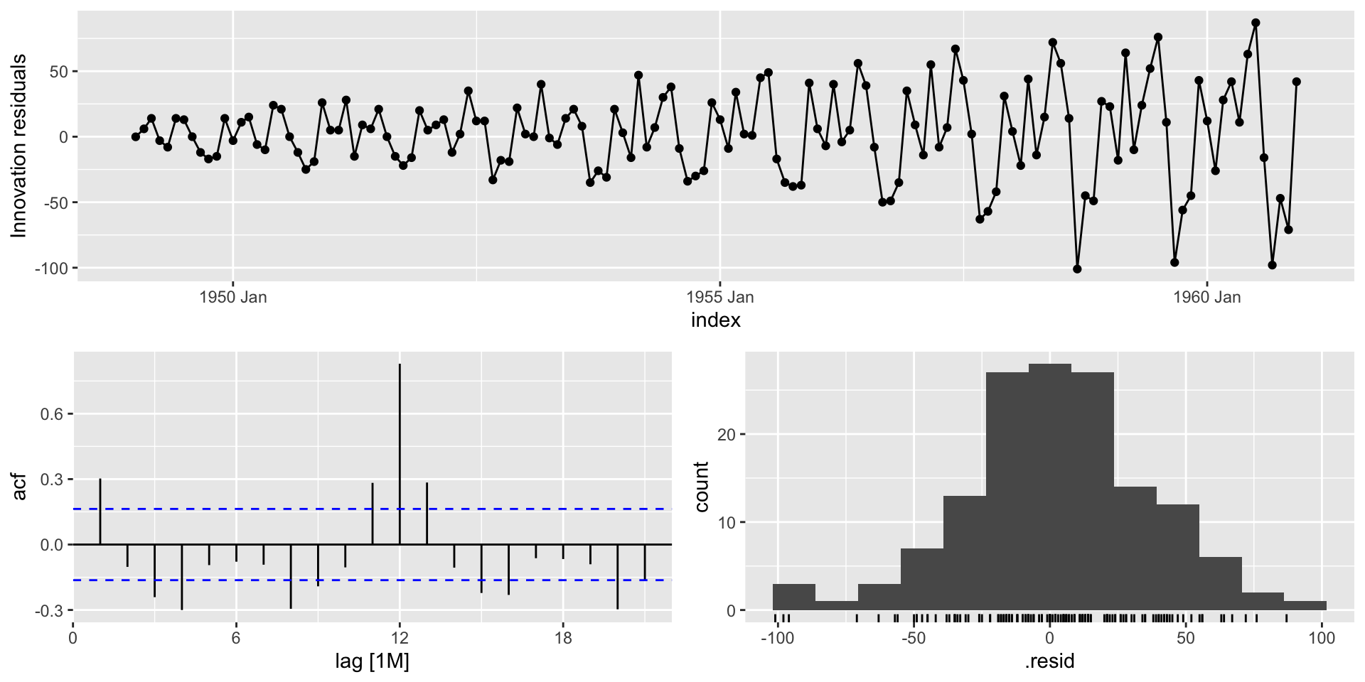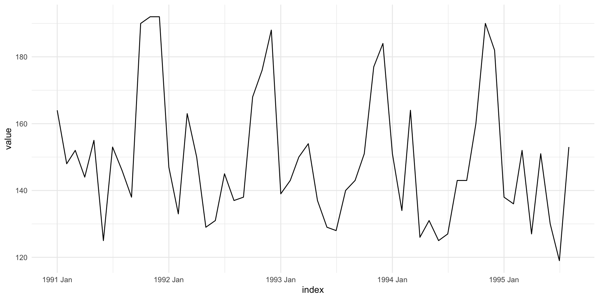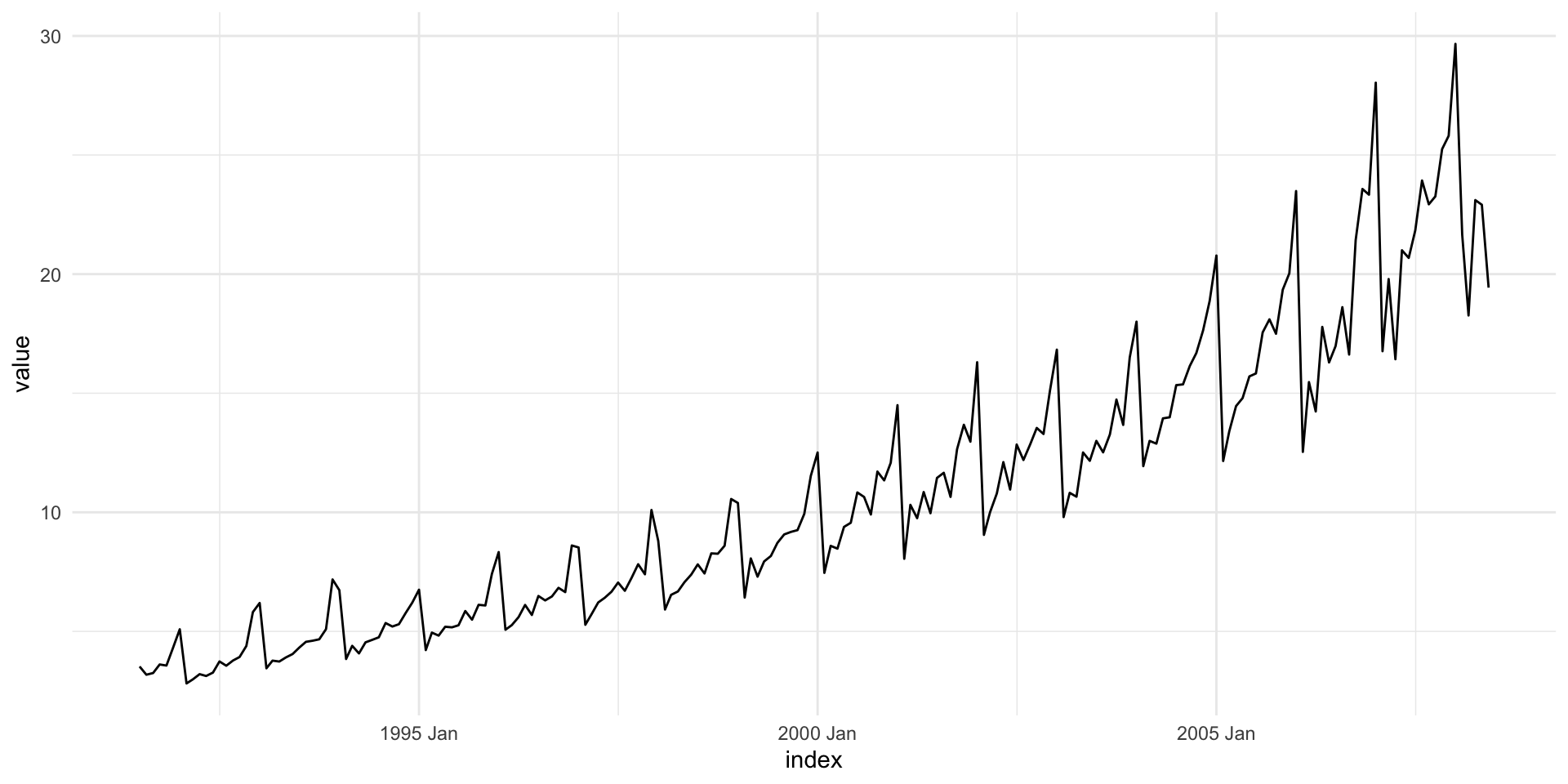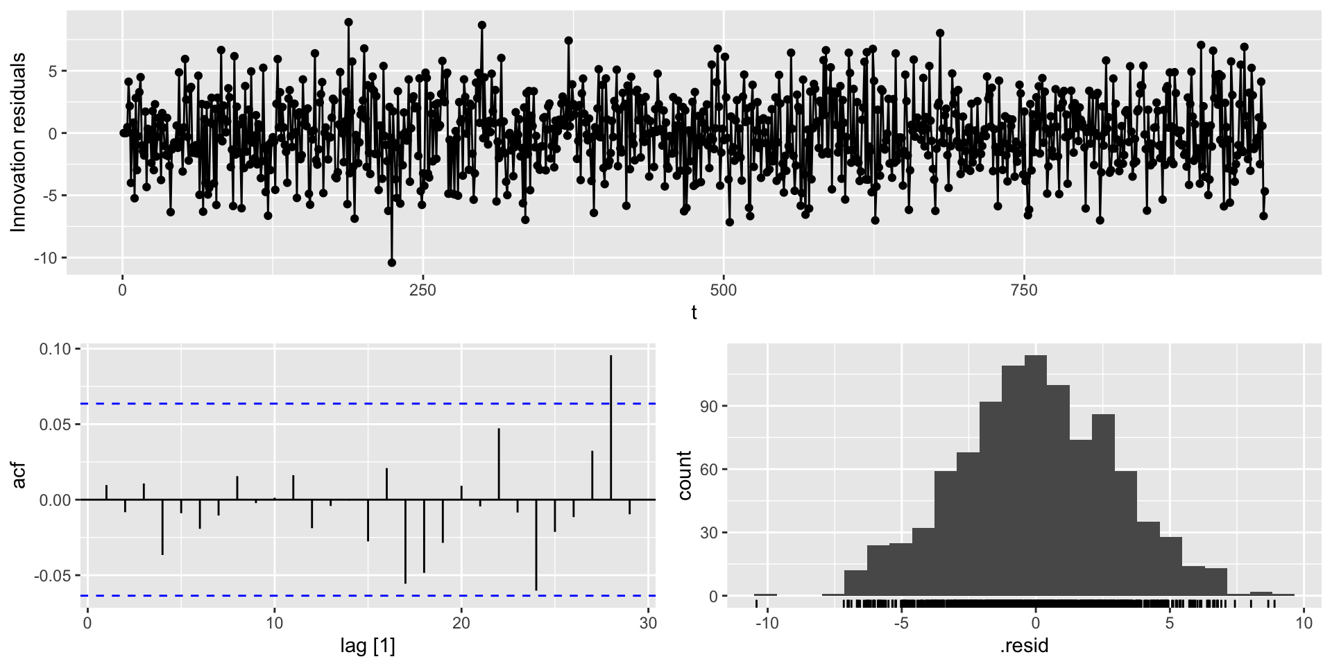 Vamos ahora a simular un \(ARIMA(2, 1, 3)_{s = 12}\) con \(\widetilde{\phi}_1 = 0.5\) y \(\widetilde{\phi}_2 = -0.8\), y \(\widetilde{\theta}_1 = -0.2\)\(\widetilde{\theta}_2 = 0.5\) y \(\widetilde{\theta}_3 = -0.6\). Tras ello vamos a realizar el ajusta en fable.