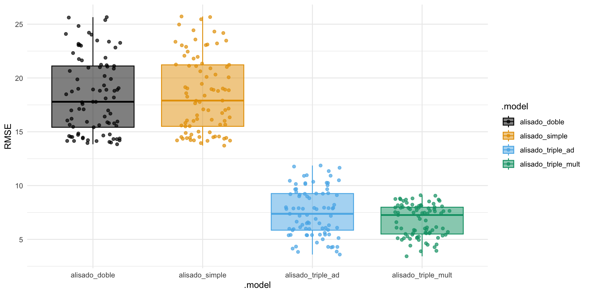 fit |>accuracy() |>ggplot(aes(x = .model, y = RMSE, fill = .model, color = .model)) +geom_boxplot(alpha =0.5) +geom_jitter(width =0.25, alpha =0.7) + ggthemes::scale_color_colorblind() + ggthemes::scale_fill_colorblind() +theme_minimal()