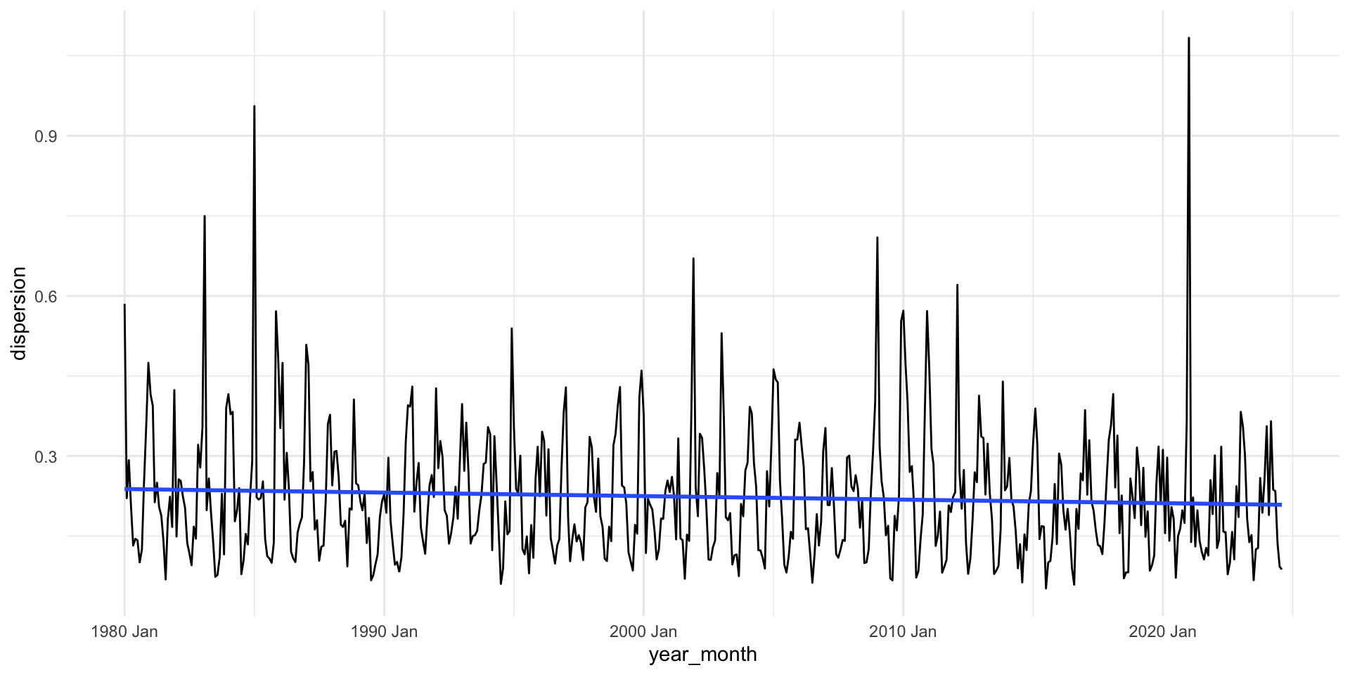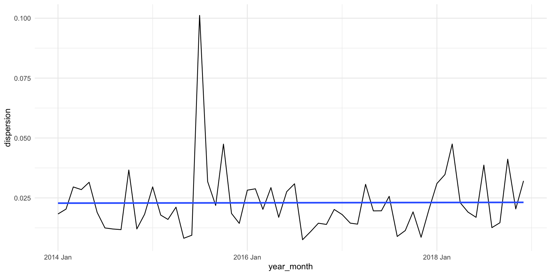 La misma idea solo que ya directamente medimos \(CV_{x} = s_{x} / \overline{x}\) y chequeamos si tiene una tendencia constante (equivalente a lo anterior)