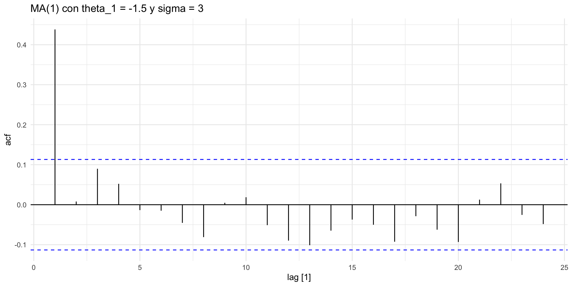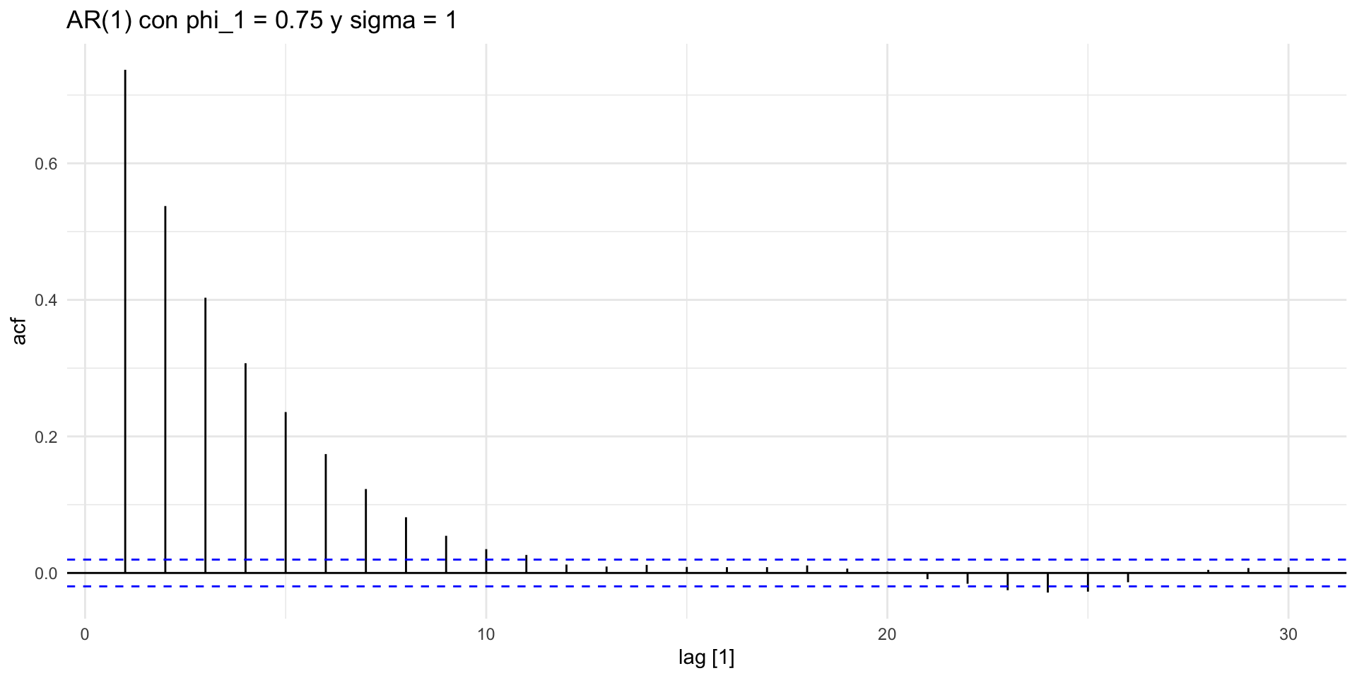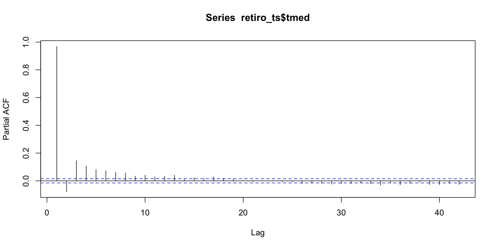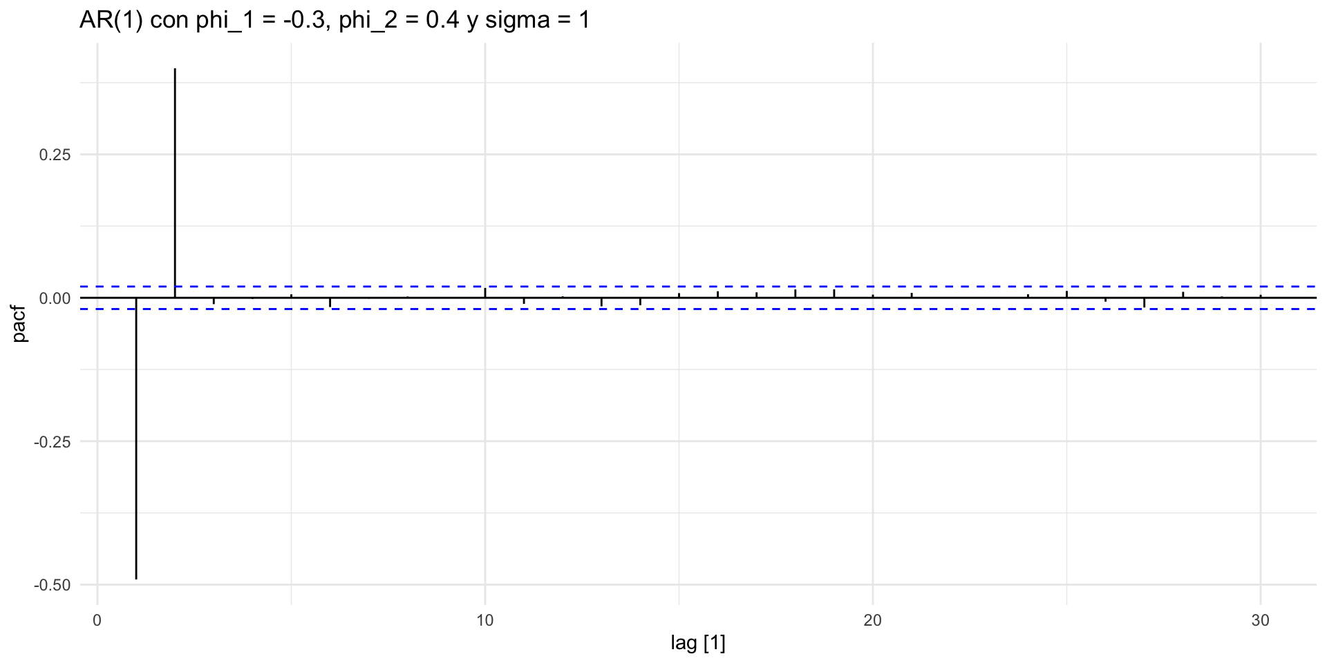 PACF: en el caso de un AR(1) las correlaciones a partir de la primera caían a 0 drásticamente; en el caso de un \(AR(1)_s\)decaen drásticamente a 0 pero a partir de la correlación \(\rho_s\).