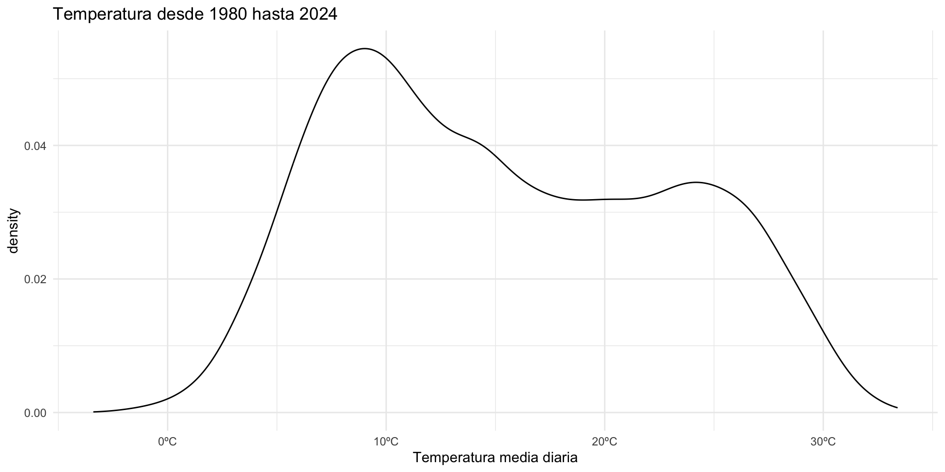 ggplot(retiro) +geom_density(aes(x = tmed)) +scale_x_continuous(labels = scales::label_number(suffix ="ºC")) +theme_minimal() +labs(title ="Temperatura desde 1980 hasta 2024",x ="Temperatura media diaria")