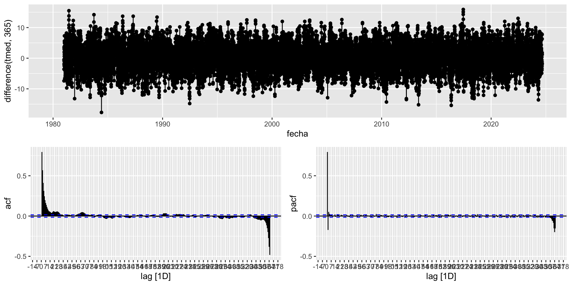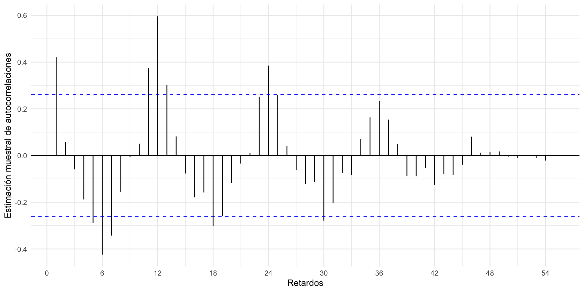 ACF: en el caso de un ARIMA(0, 2, 0) las correlaciones tenían tendencia sin decaer a 0; en el caso de un \(SARIMA(0, 2, 0)_s\) dicho comportamiento sucede en general PERO sobre todo en las correlaciones múltiplos de s.