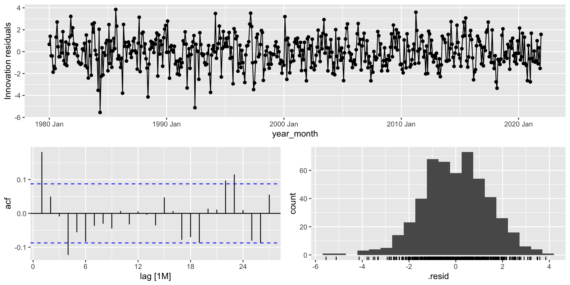 fit <- train |>model("ARMA_stepwise"=ARIMA(X_t ~pdq(p_init =1, d =0, q_init =1), ic ="bic",greedy =FALSE))estimaciones <- fit |>augment()report(fit)