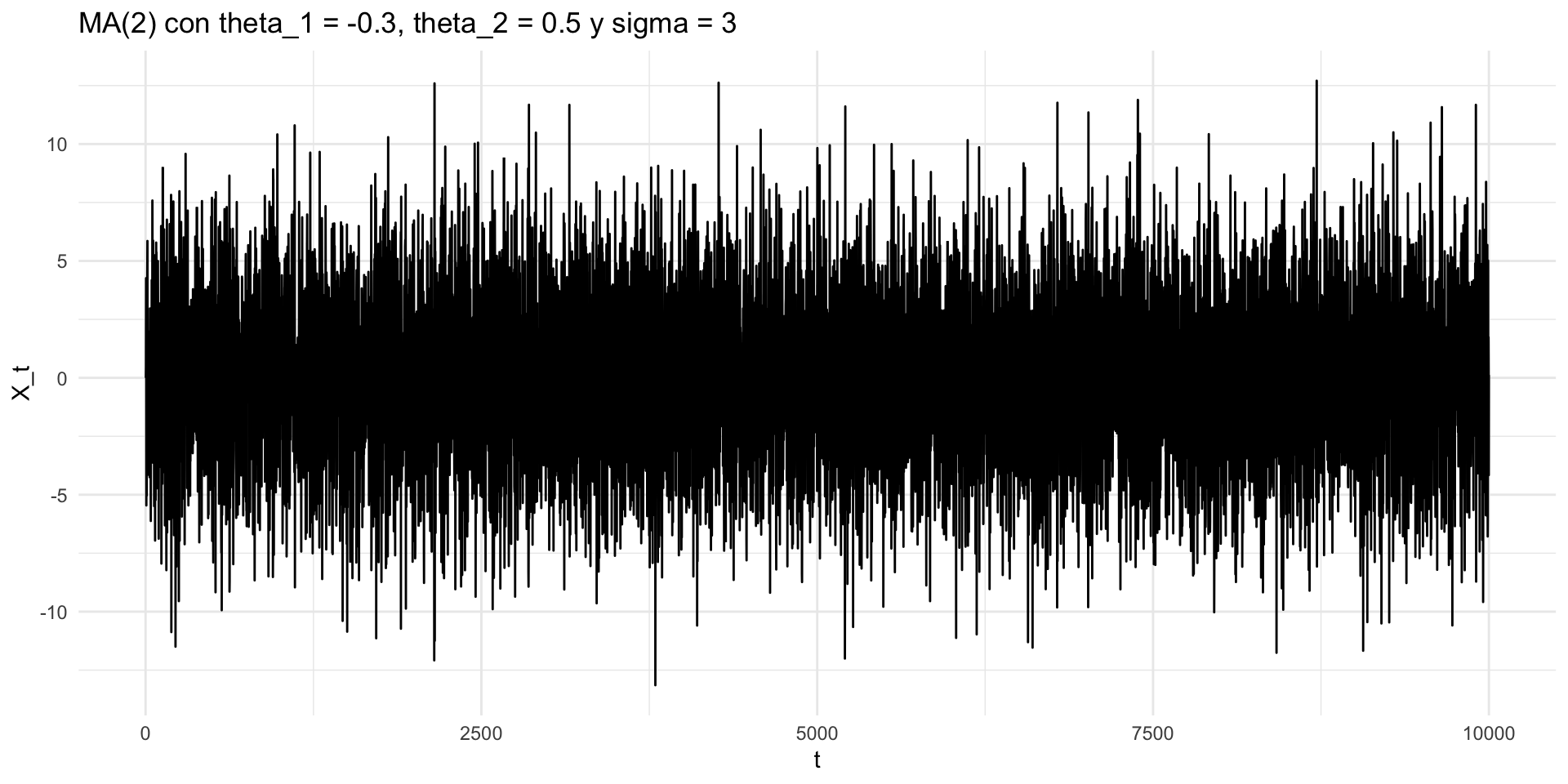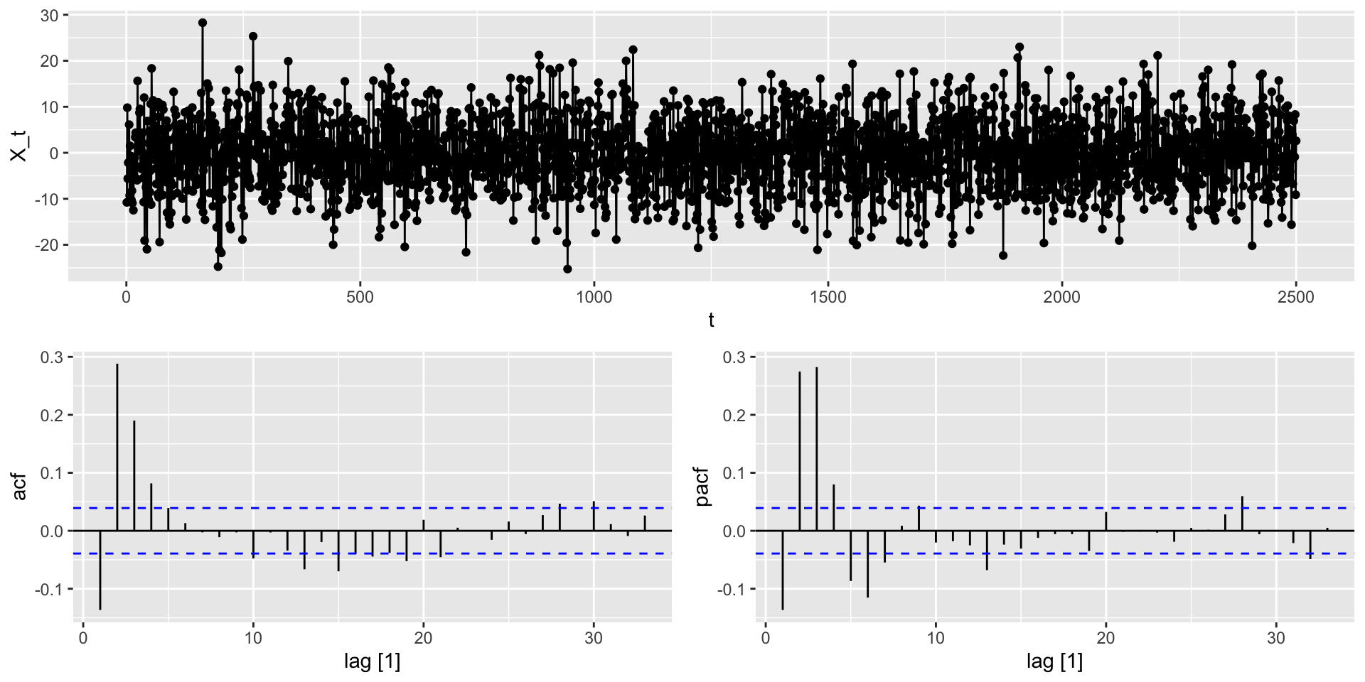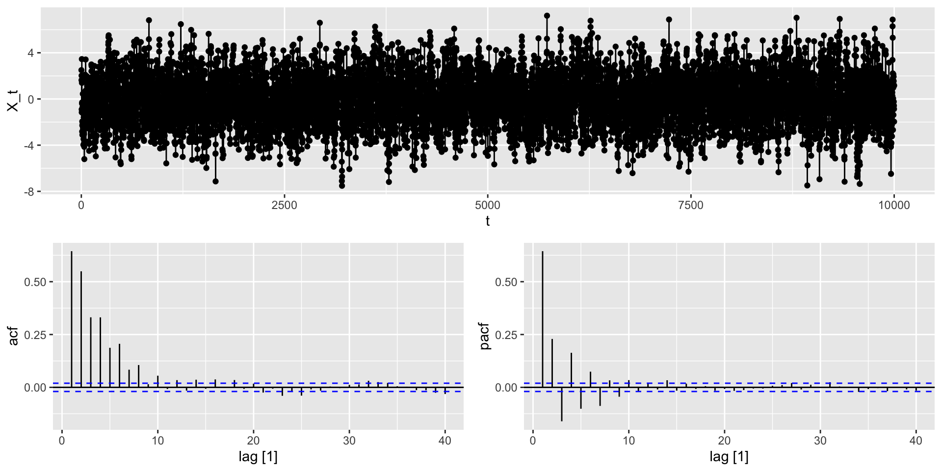n <-10000SARMA_23 <-tibble("t"=1:n,"X_t"=sarima.sim(n = n, sar =c(0.5, -0.8),sma =c(-0.2, 0.5, -0.6), S =12, sd =1.5)) |>as_tsibble(index = t)