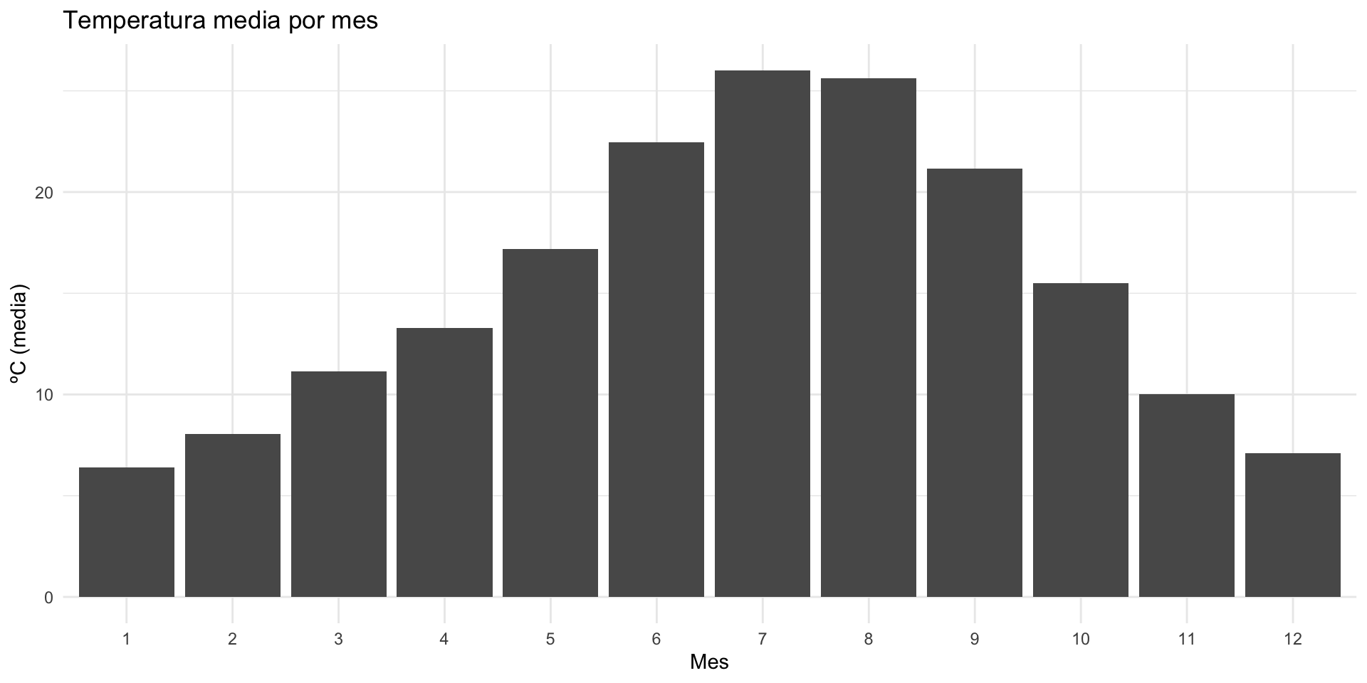 ggplot(retiro |>mutate(mes =as_factor(lubridate::month(fecha))) |>summarise(mean_temp =mean(tmed, na.rm =TRUE),.by ="mes")) +geom_col(aes(x = mes, y = mean_temp)) +theme_minimal() +labs(title ="Temperatura media por mes",x ="Mes", y ="ºC (media)")