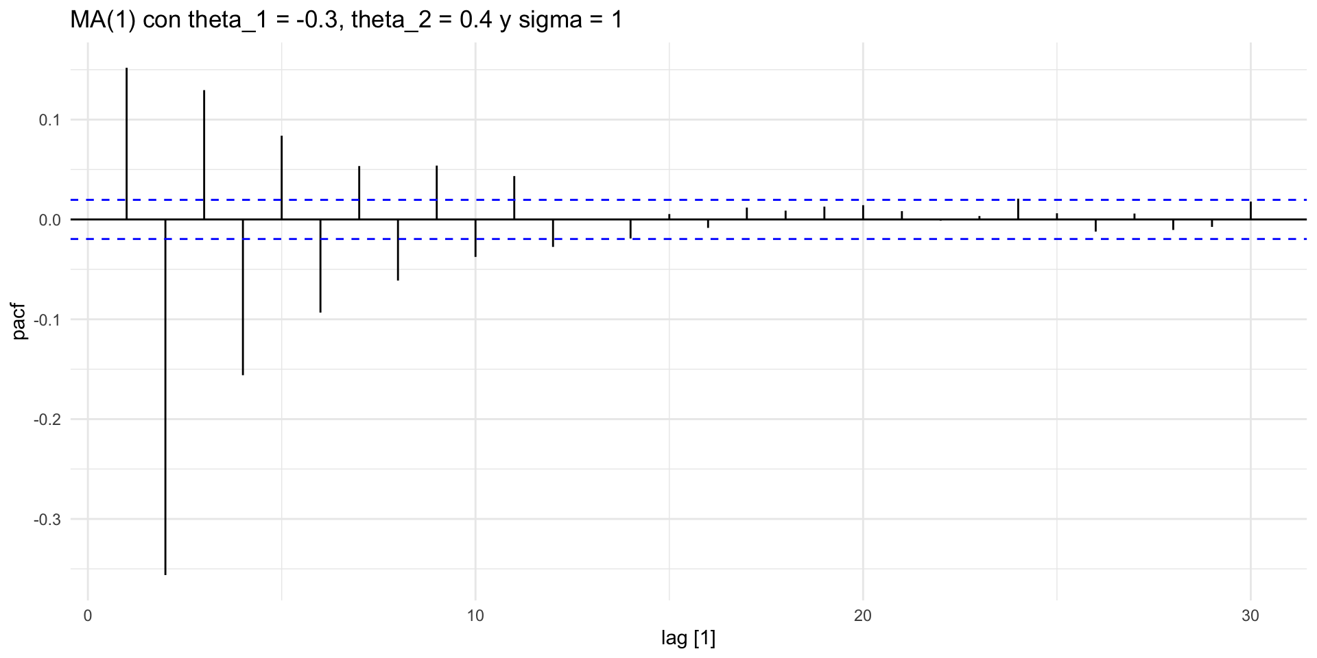 Si tuviese solo parte AR(p) -> autocorrelaciones parciales caerían a 0 a partir del retardo \(p\).