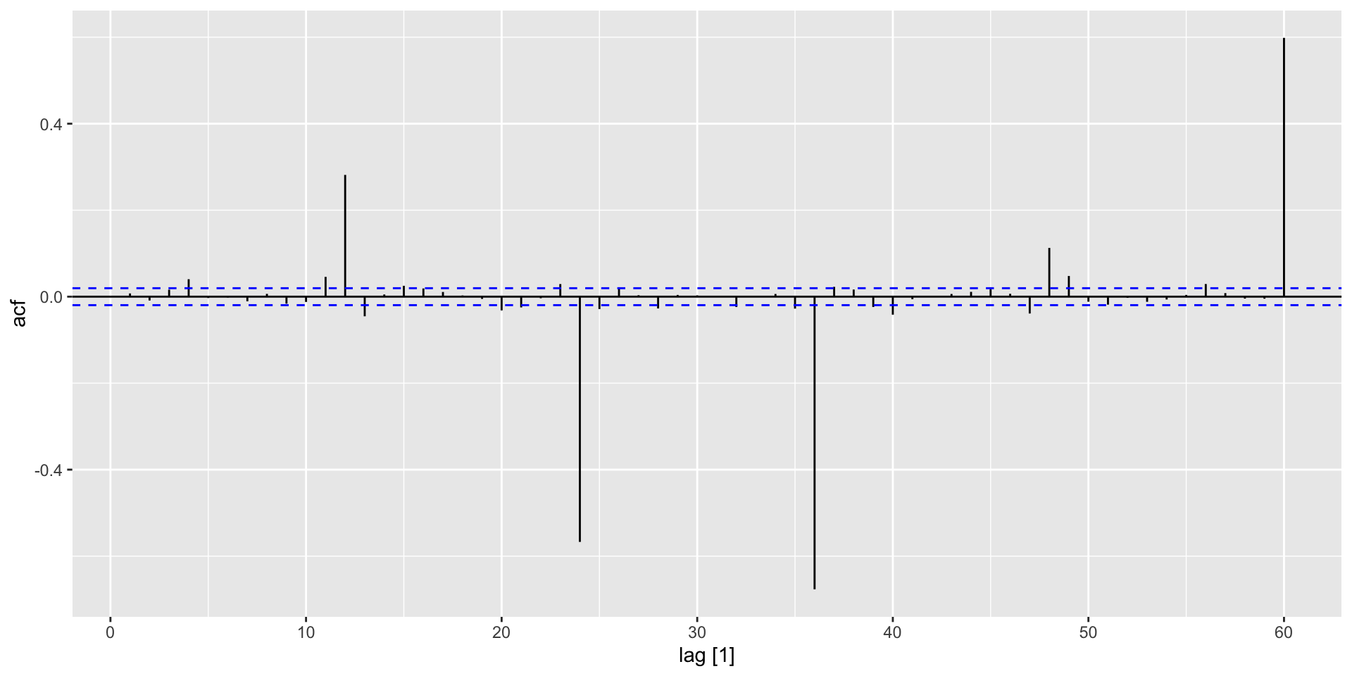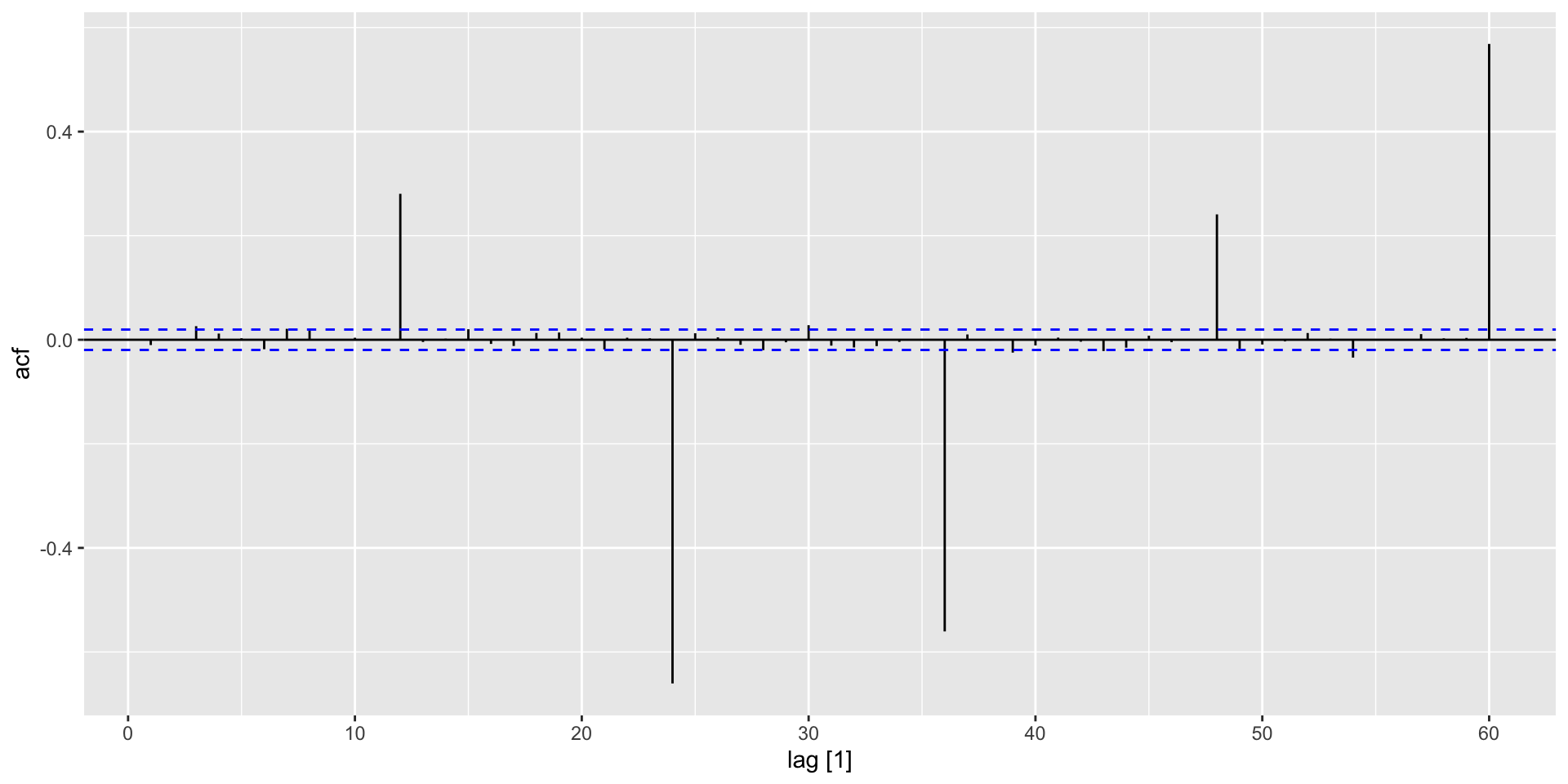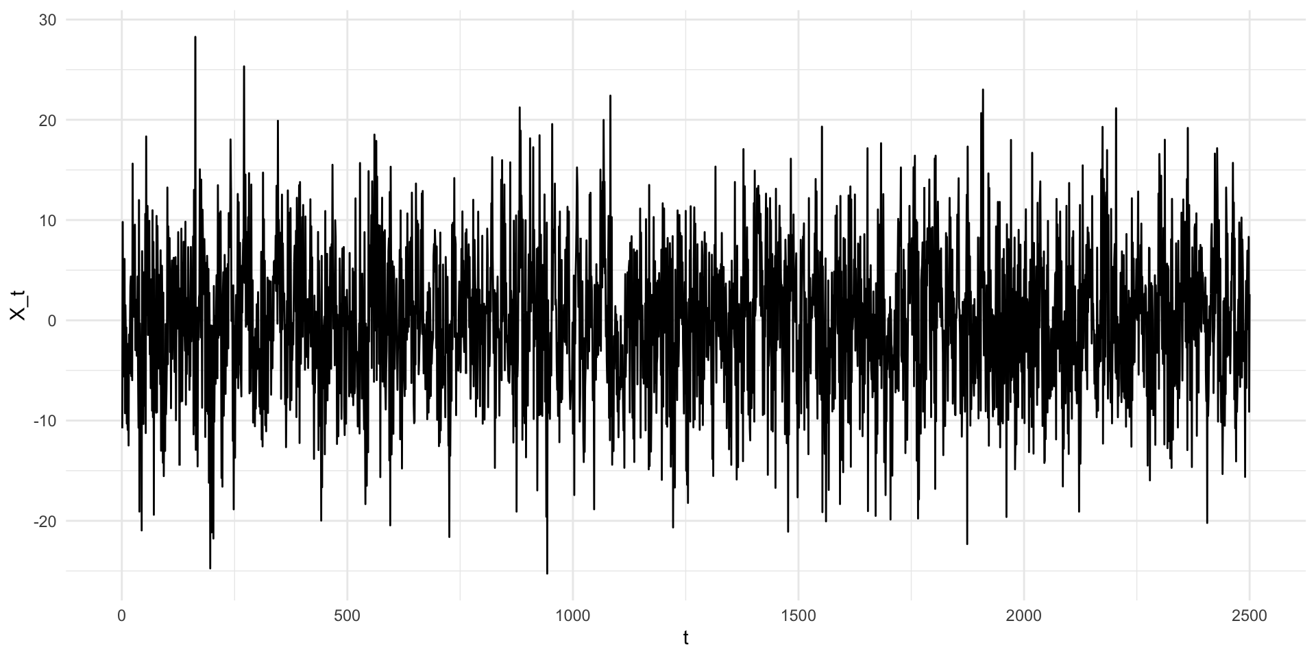 n <-5000set.seed(1234567)SARMA_213 <-tibble("t"=1:n,"X_t"=sarima.sim(n = n, ar =0.5, ma =-0.9, d =2,sar =-0.7, sma =0.8, D =1,S =12, sd =1)) |>as_tsibble(index = t)