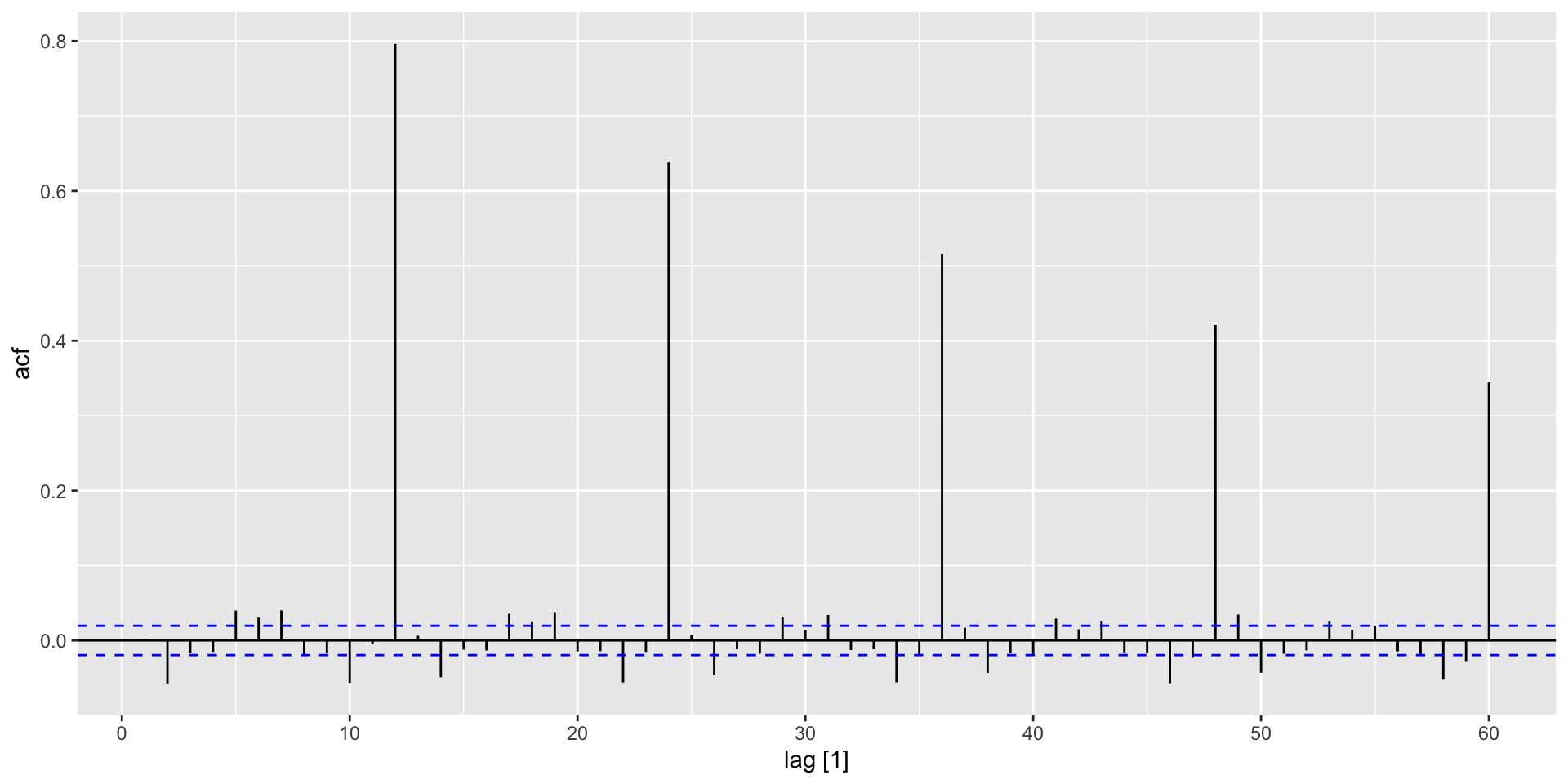 ACF: en el caso de un AR(2) las correlaciones descendían a 0 asintóticamente; en el caso de un \(AR(2)_s\) dicho comportamiento sucede PERO solo en las correlaciones múltiplos de s.
