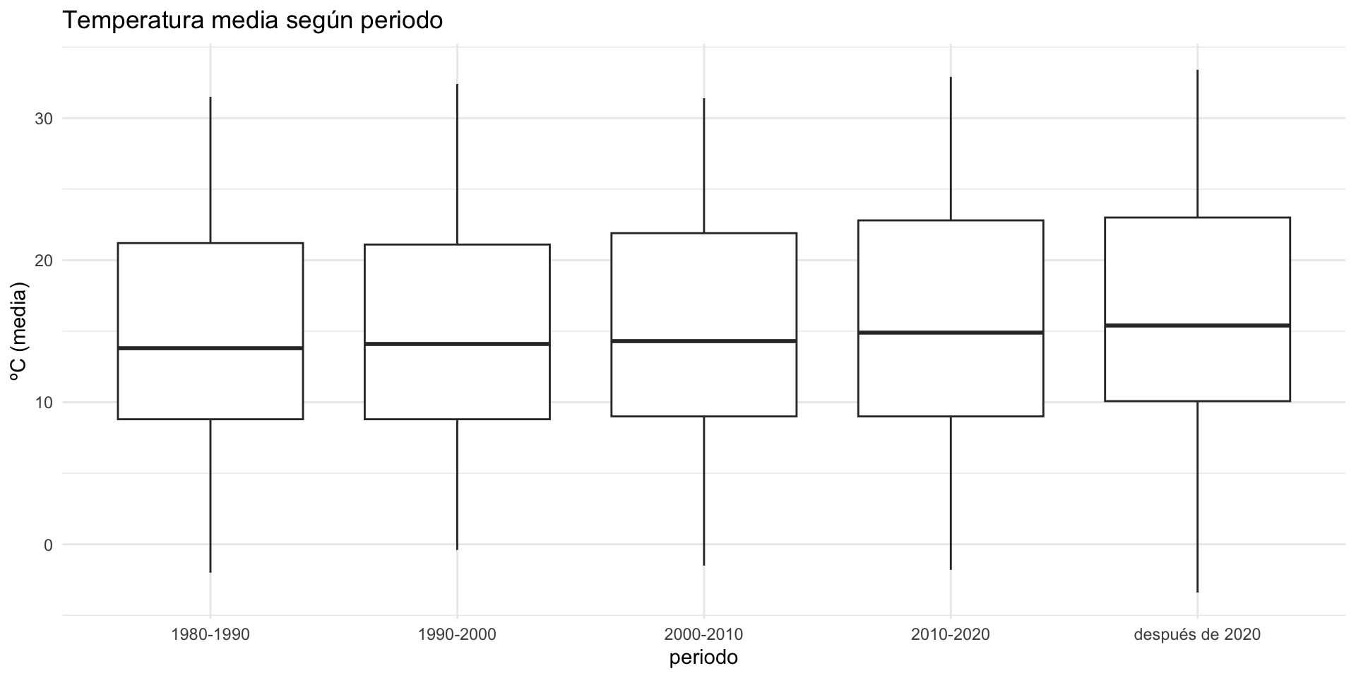ggplot(retiro |>mutate(periodo =if_else(fecha <as_date("1990-01-01"),"1980-1990",if_else(fecha <as_date("2000-01-01"),"1990-2000",if_else(fecha <as_date("2010-01-01"),"2000-2010",if_else(fecha <as_date("2020-01-01"),"2010-2020", "después de 2020")))))) +geom_boxplot(aes(x = periodo, y = tmed)) +theme_minimal() +labs(title ="Temperatura media según periodo",x ="periodo", y ="ºC (media)")